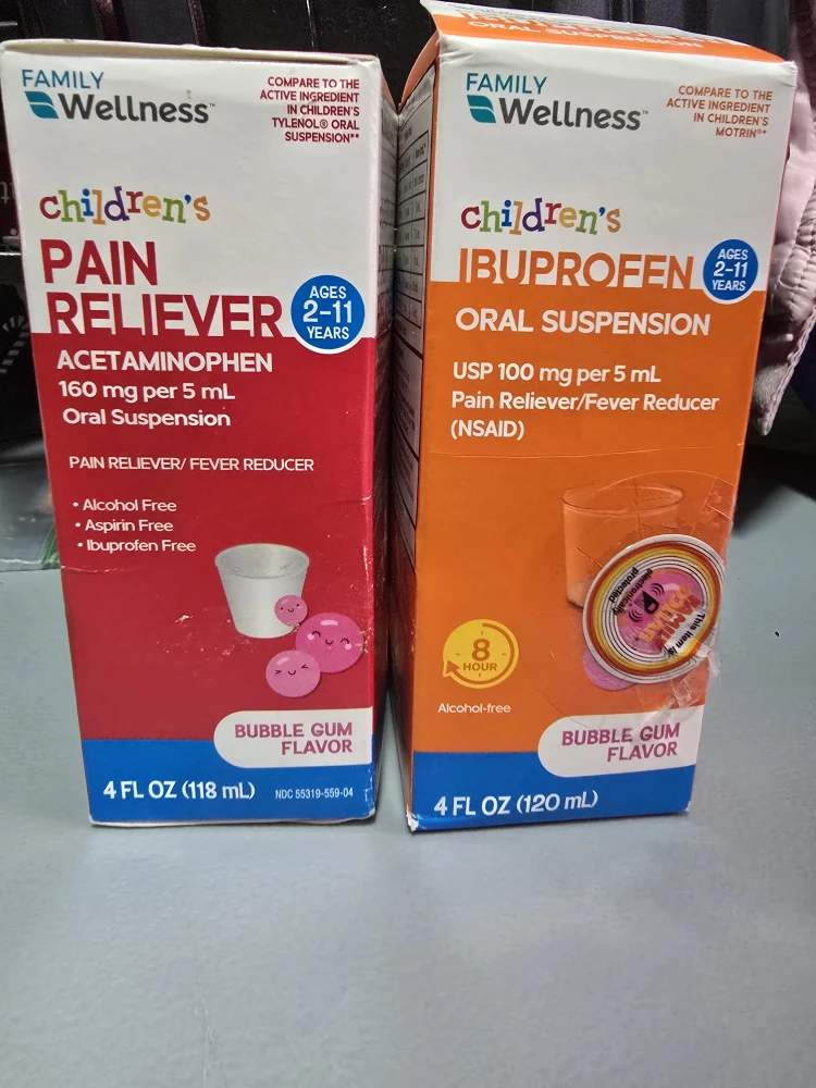 Gifting two boxes of Family Wellness children's medicine. One is Pain Reliever Acetaminophen, and the other is Ibuprofen oral suspension which was only used once but my daughter didn't like it.