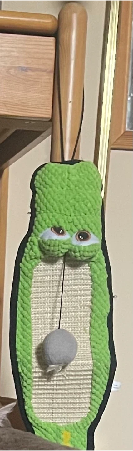 This is an avocado shaped cat scratcher toy. It's green with a sisal scratching surface and a hanging ball for your cat to play with. It's in great condition and ready for a new feline friend!