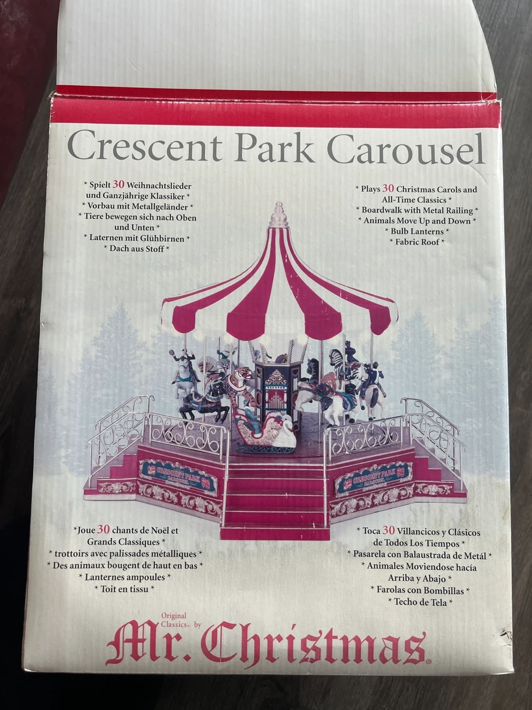 Selling a Mr. Christmas Crescent Park Carousel! It plays Christmas carols and all-time classics. The animals move up and down, and it has bulb lanterns and a fabric roof. Comes with the original box
