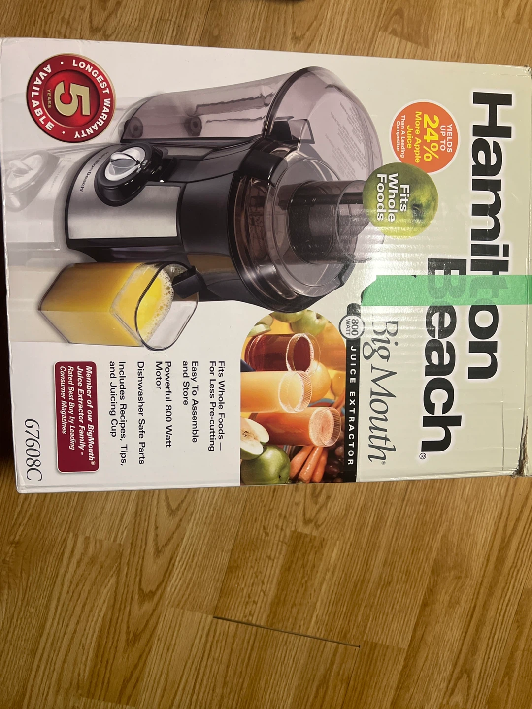 Hamilton Beach Big Mouth Juice Extractor. It has a powerful 800-watt motor and can fit whole foods for less pre-cutting.