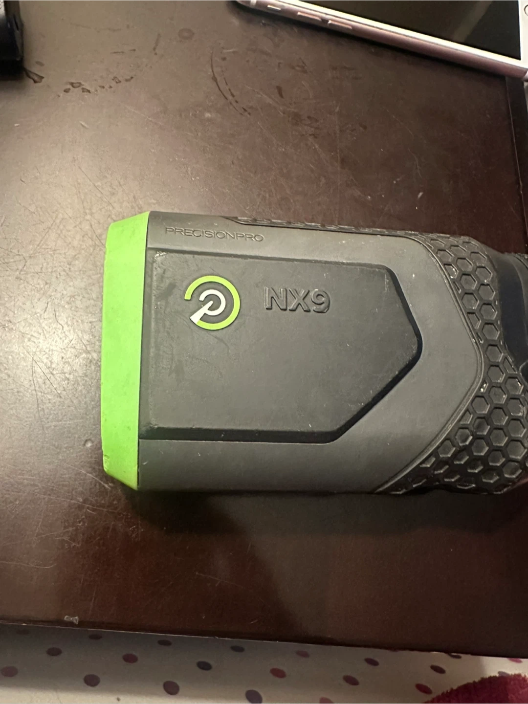 This is a Precision Pro NX9 golf rangefinder. It has a grey and green design. It's ideal for golfers looking for accurate distance measurements on the course. Features include multiple modes for different playing conditions.