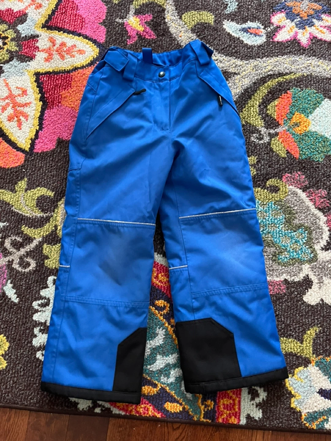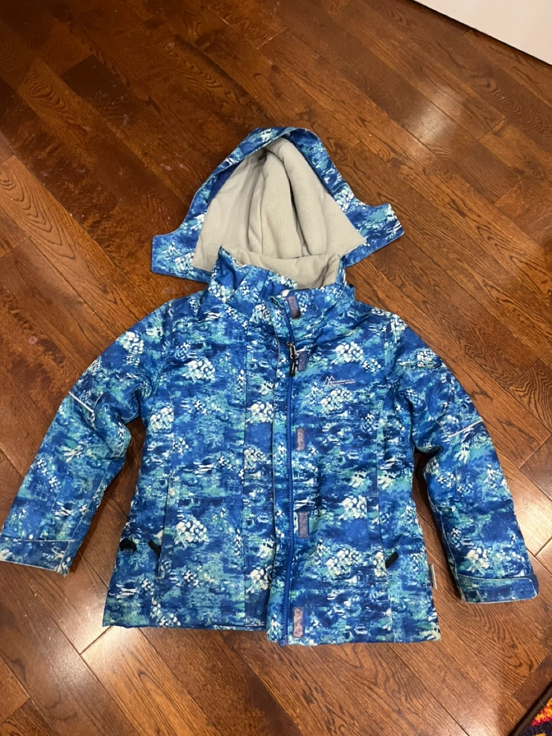 Selling a Stormpack snow pants so 6 and jacket set in size 7! The jacket features a blue pattern, while the pants are a solid blue with black accents. Both are made of 100% polyester. Bought from Costco