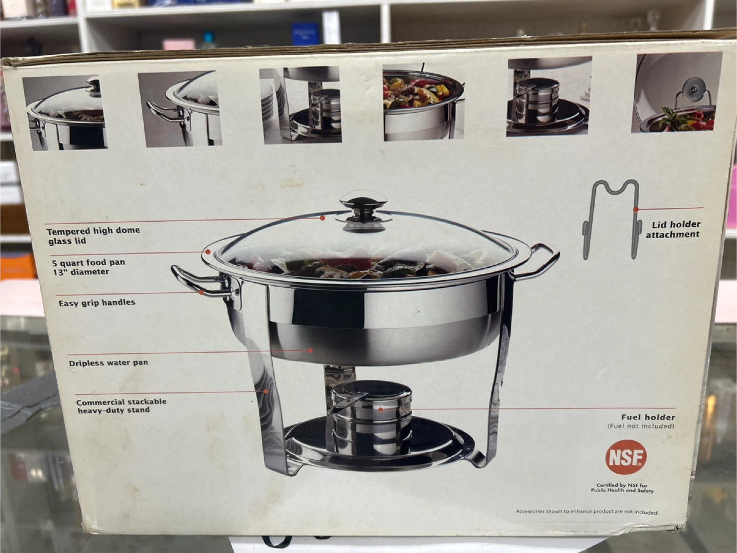 Selling a commercial 5QT chafing dish made of 18/10 stainless steel with a tempered glass lid. It features a tempered high dome glass lid, a 5-quart food pan with a 13" diameter, and easy grip handles. Also includes a dripless water pan and a commercial stackable heavy-duty stand. Fuel holder is not included. Box is included
