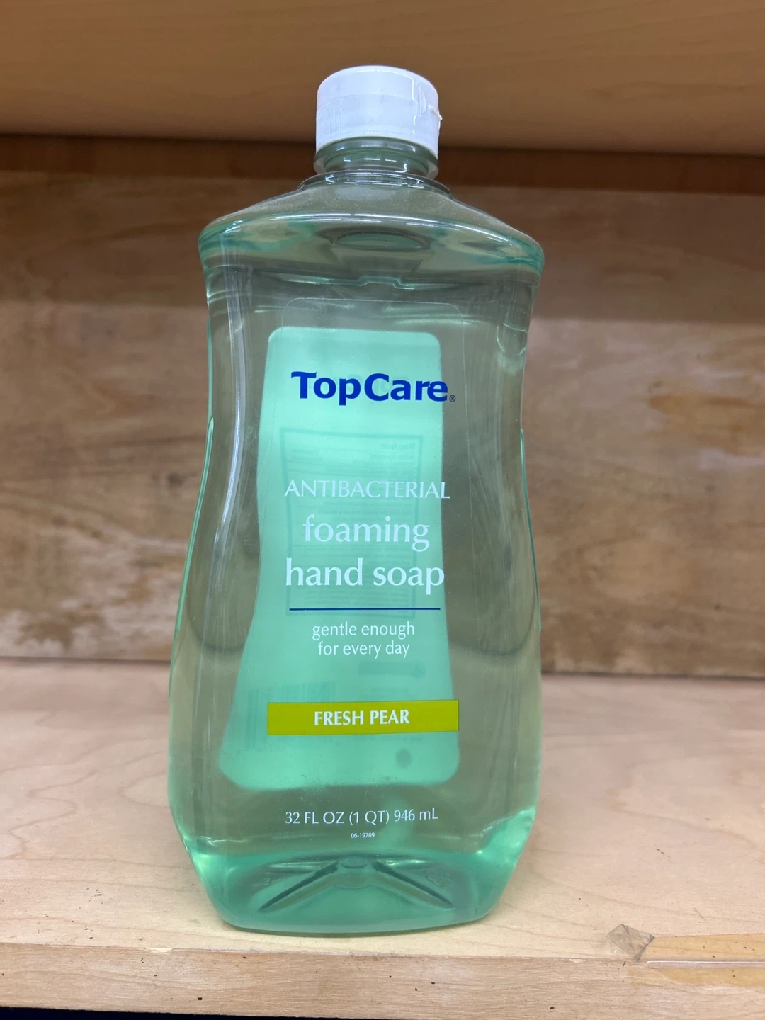 Selling a bottle of TopCare antibacterial foaming hand soap in Fresh Pear scent. It's a 32 fl oz bottle, perfect for keeping your hands clean and smelling great! Gentle enough for everyday use