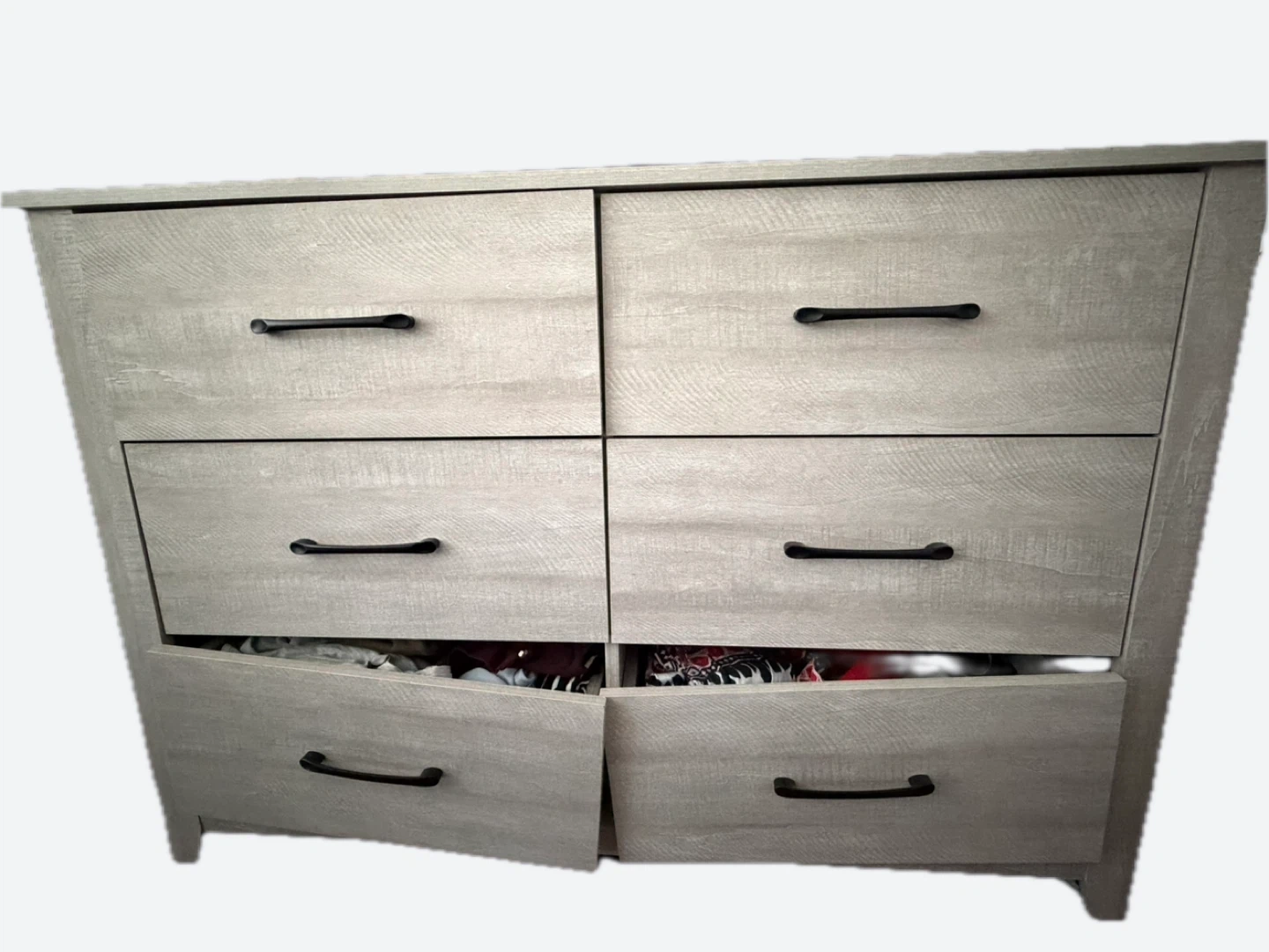 Here's a lovely light wood dresser with six drawers! It's perfect for adding some extra storage to your bedroom or living space. 2 rail drawers are broken but if you know how to fix it, it’s yours. The drawers have sleek, black handles that give it a modern look!