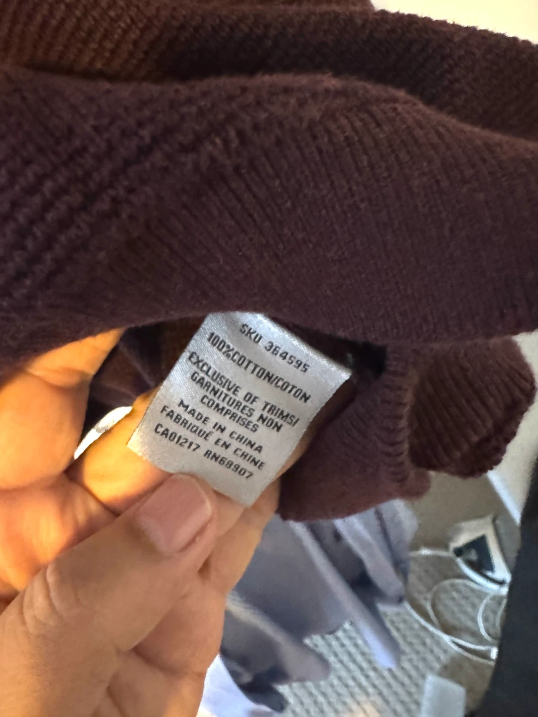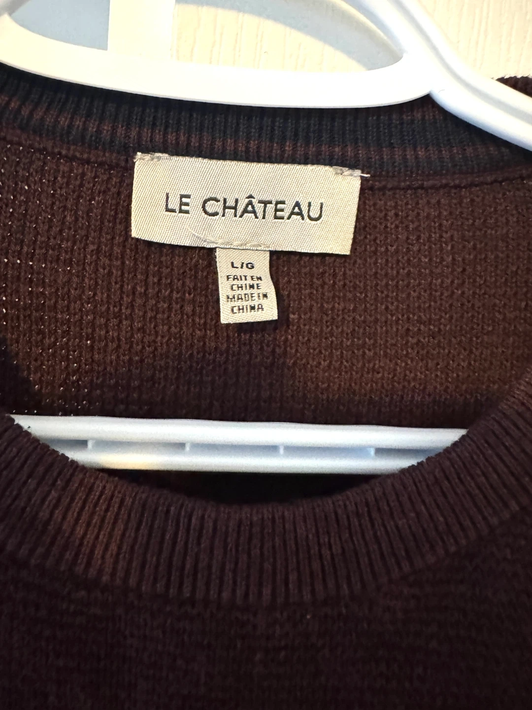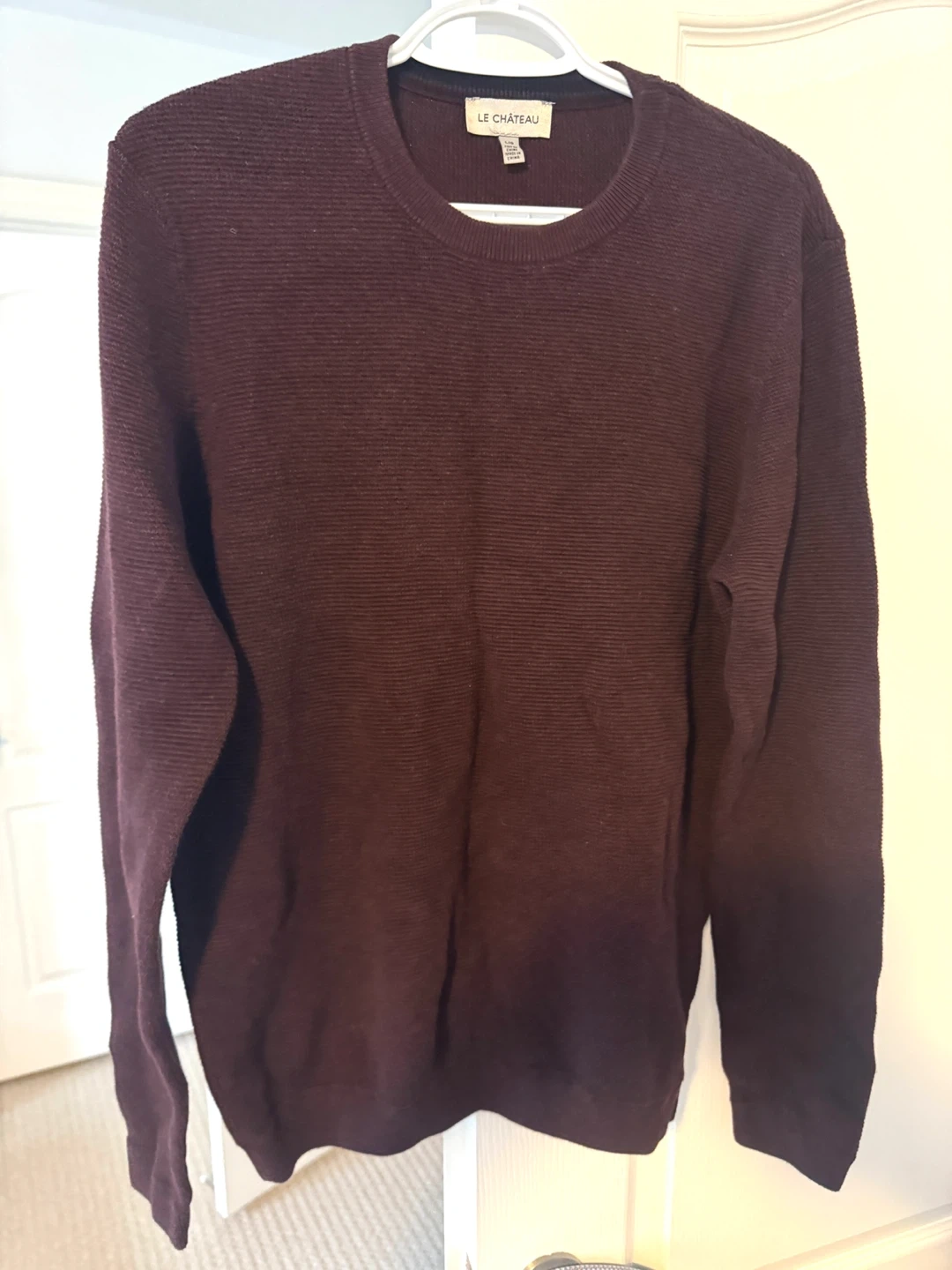 Selling a Le Chateau sweater in burgundy! It's a size large and made of 100% cotton