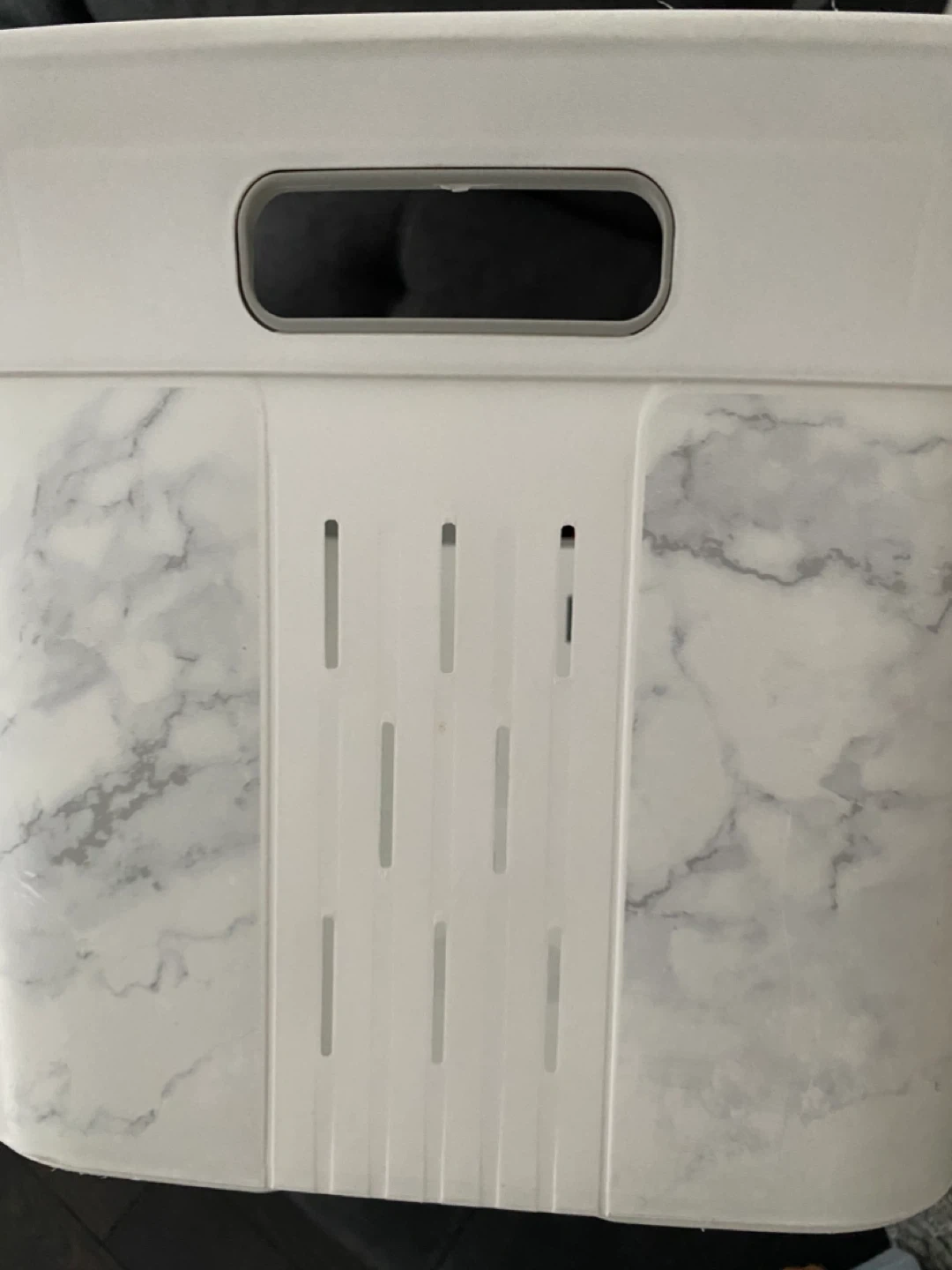 Laundry basket in great condition! It's white with a marble design on the sides. Perfect for keeping your laundry organized.