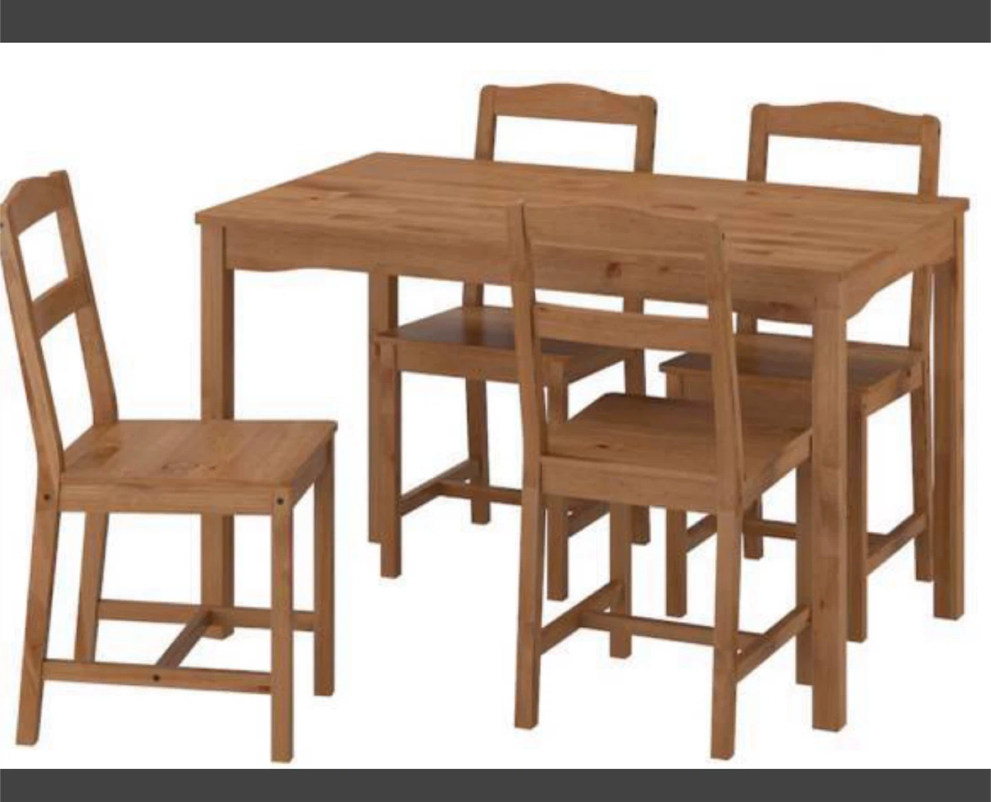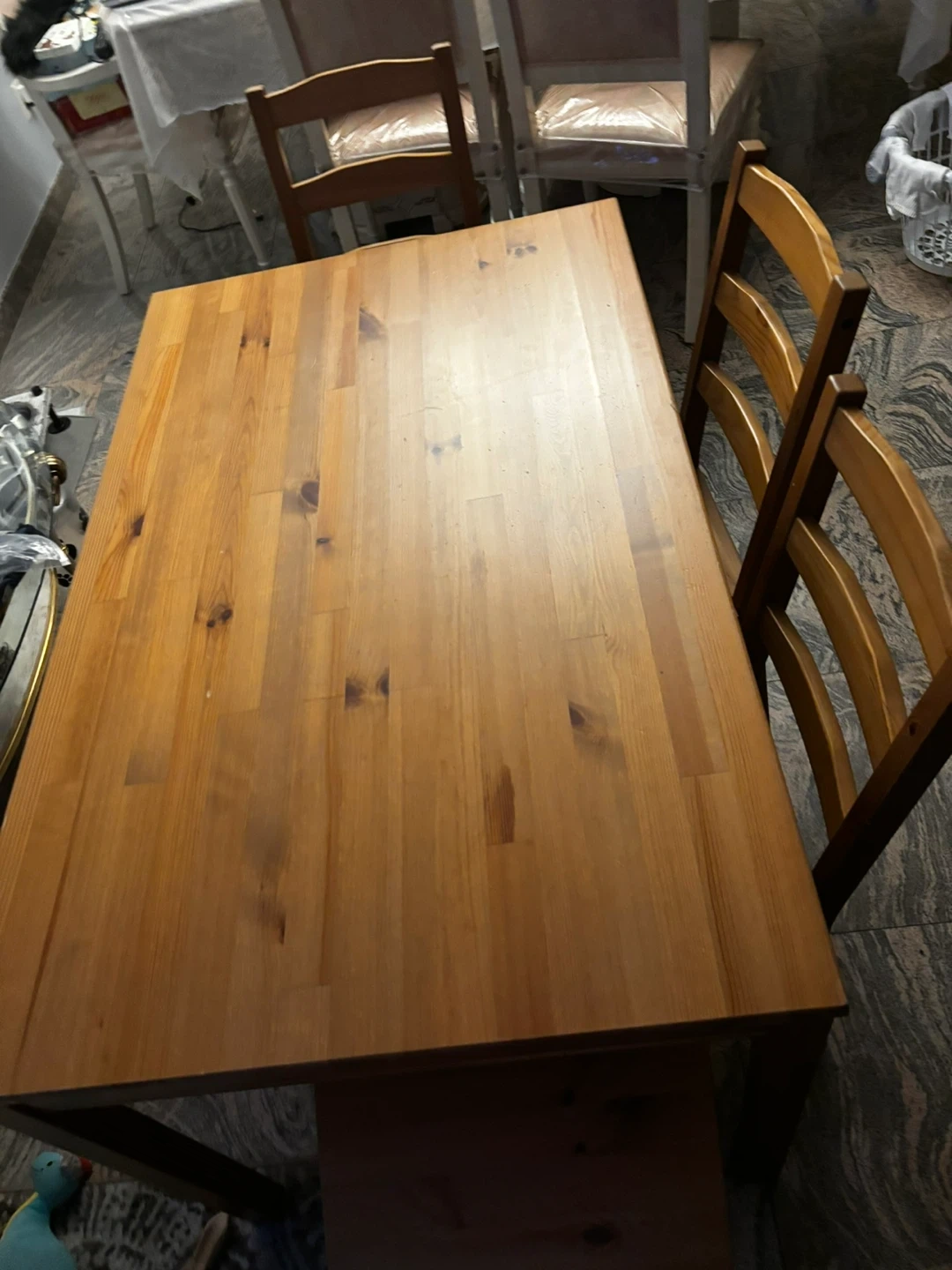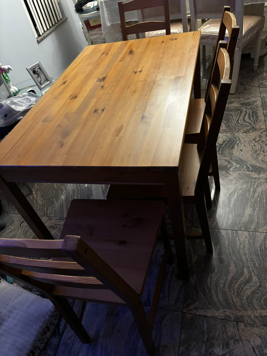Selling a wooden dining table with four chairs. It's a great set for a small dining area or kitchen. The table and chairs are in good condition and ready to use!