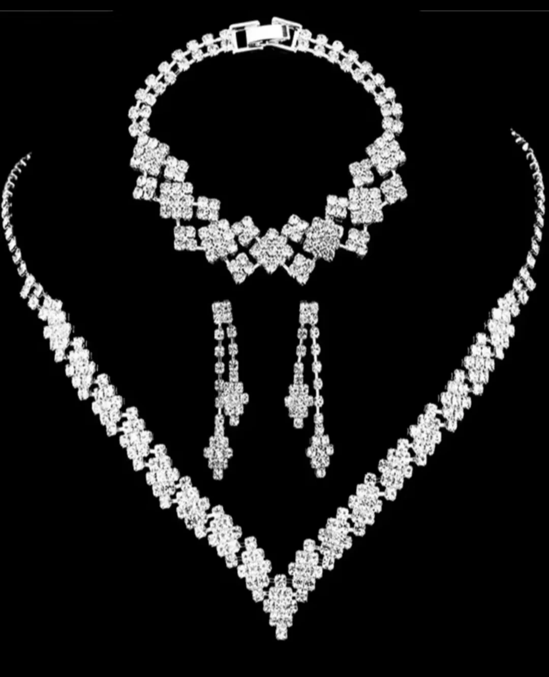 Sparkly rhinestone jewellery set for sale! Includes a necklace, bracelet, and earrings. Perfect for adding a touch of glamour to any outfit!