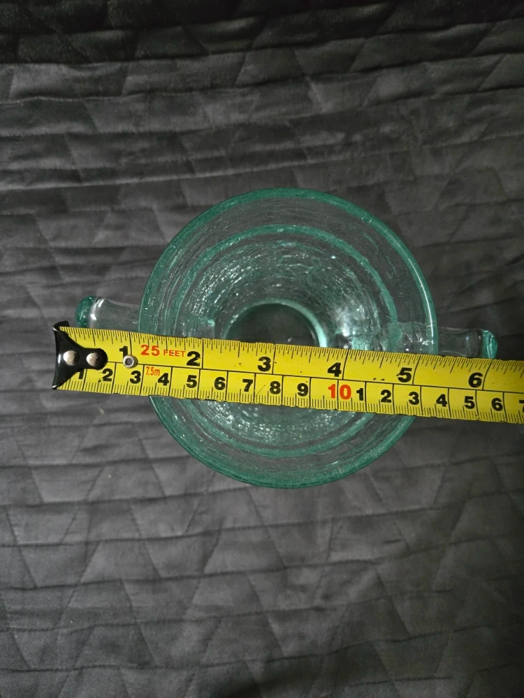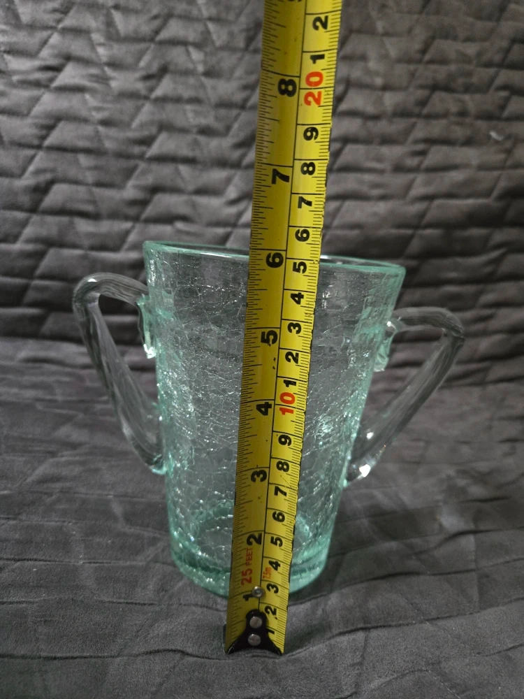 Here's a lovely crackled glass vase with two handles! It stands approximately 7.5 inches tall and has a diameter of about 4 inches at the top. Perfect for adding a touch of vintage charm to your home decor. No chips or cracks, well only the ones that are supposed to be there.. lol...