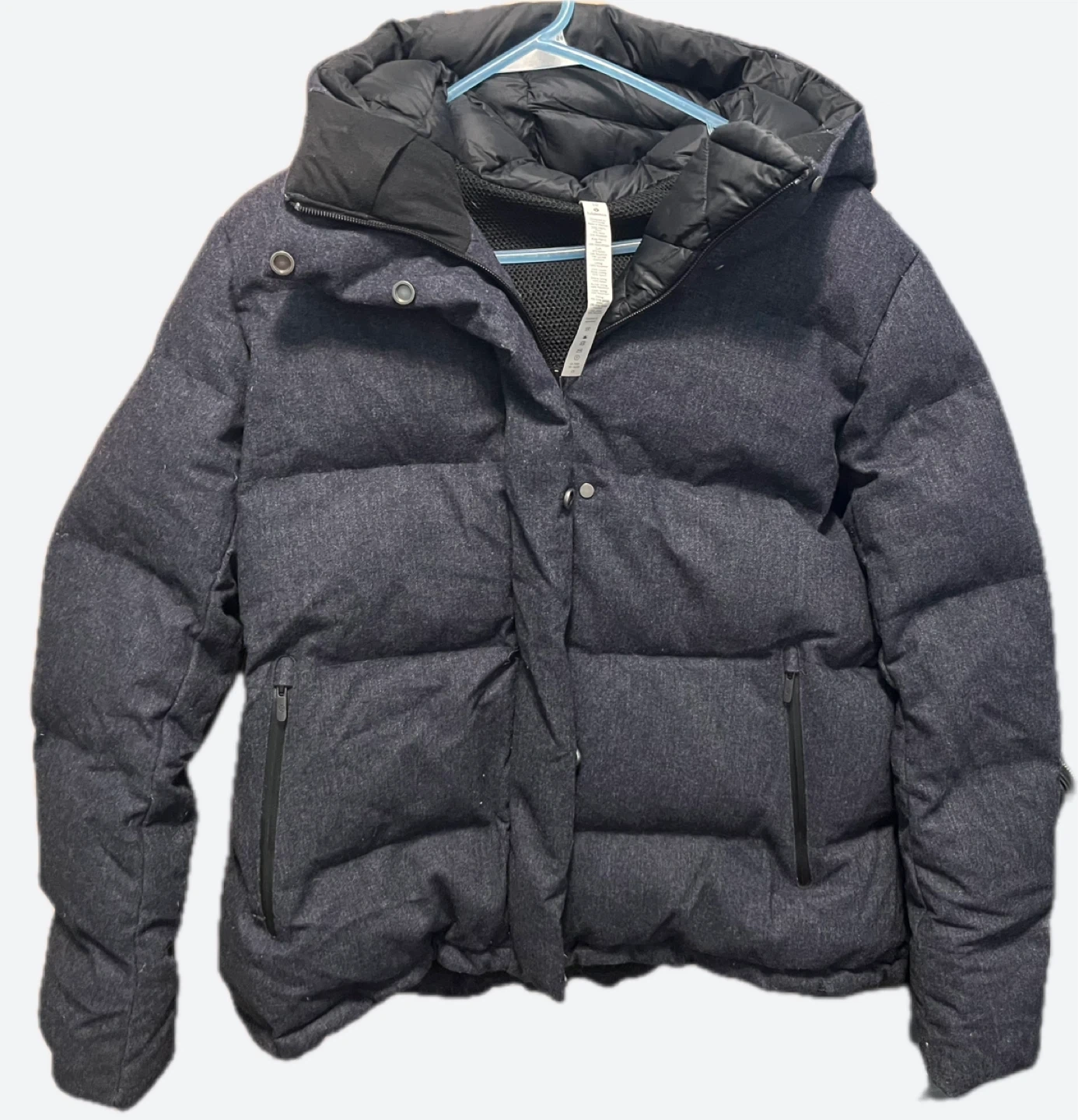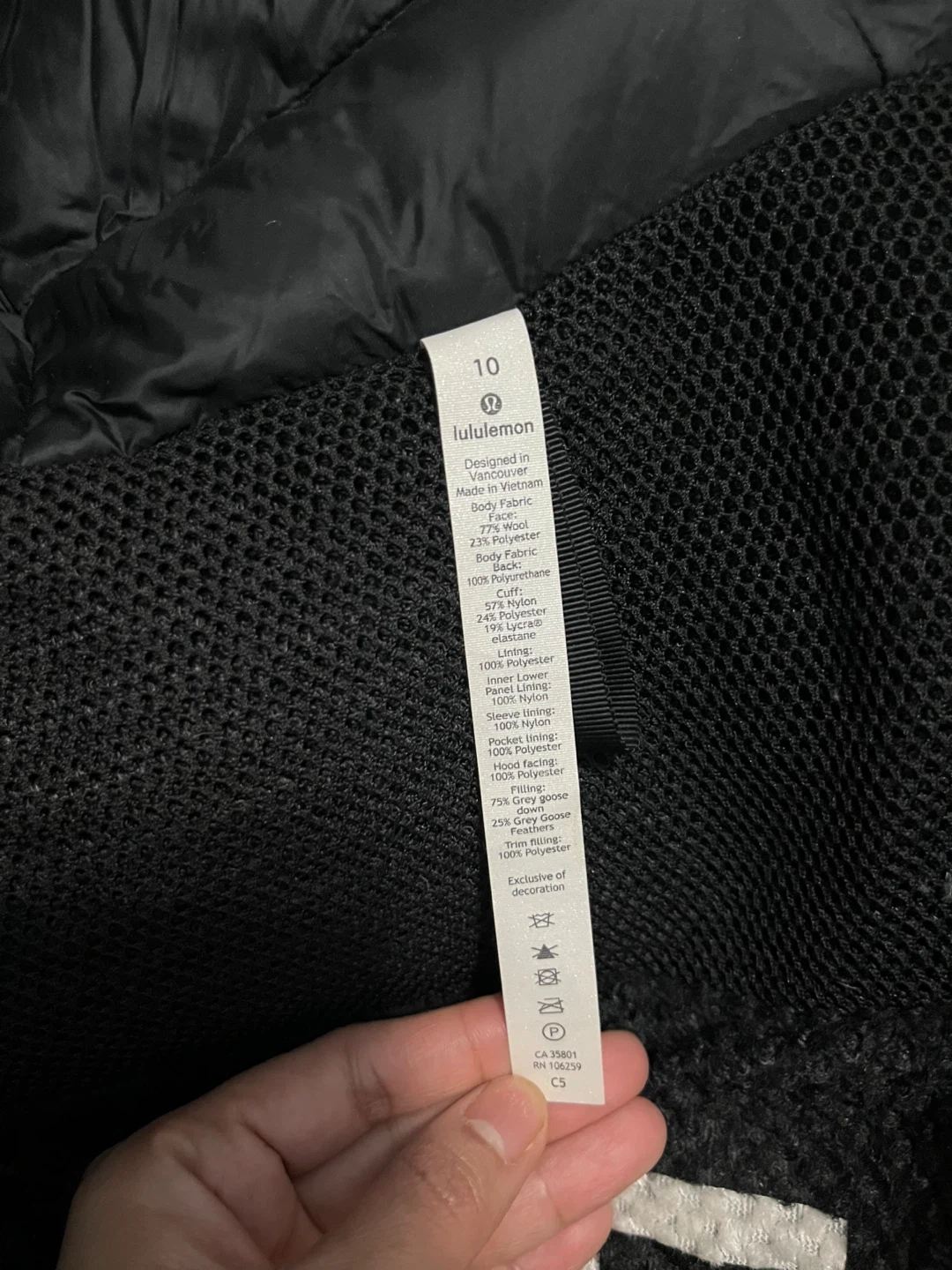 Selling a Lululemon down puffer jacket in size 10. It's in great condition and ready to keep you warm this winter! The jacket features a body made of 77% wool and 23% polyester, with a lining of 100% polyester. The fill consists of 75% grey goose down and 25% grey goose feathers. A stylish and practical addition to your wardrobe!