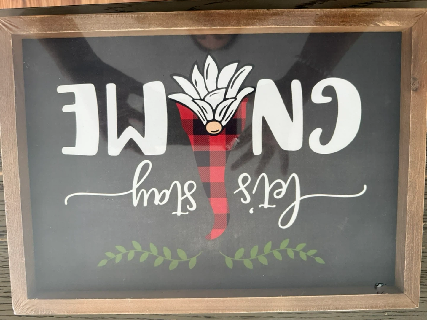 Cute 'Let's Stay Home' sign featuring a gnome with a red and black buffalo check hat. It would look great in any room! New in plastic.