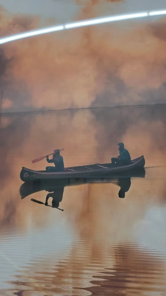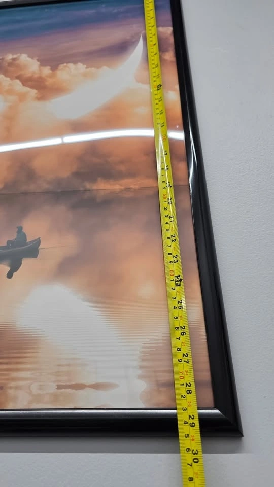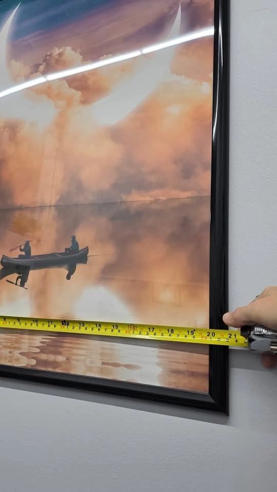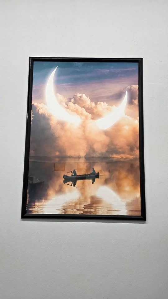 Selling a stunning 20 x 28 inch framed art print titled “Let There Be Light” by Andy Okay — featuring a surreal nighttime scene with a glowing crescent moon, dramatic clouds, and a canoe floating across reflective water.