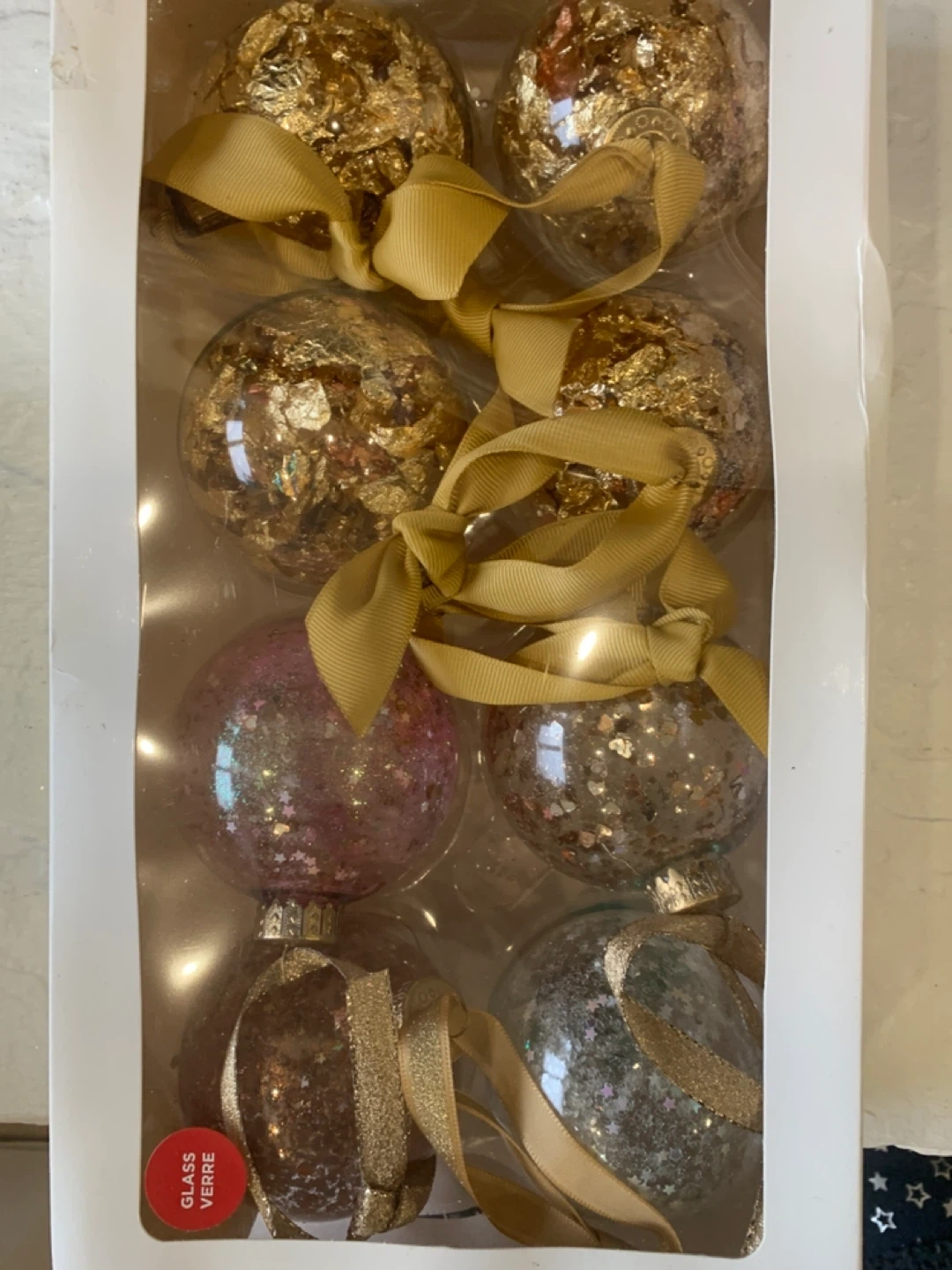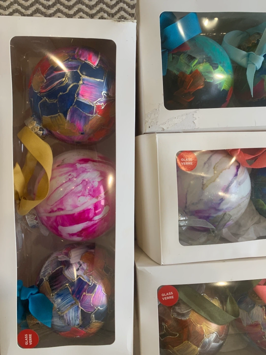 Selling sets of four hand-painted glass Christmas ornaments. They come in a variety of unique designs and colours. Each set is brand new in its original box, ready to add a touch of artistry to your holiday decor!
