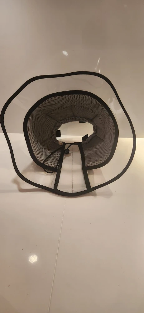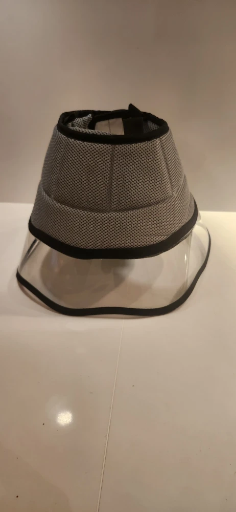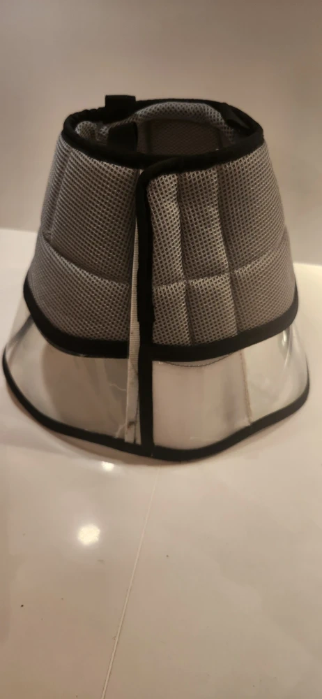 Selling a pet recovery collar, perfect for preventing your furry friend from licking or scratching wounds after surgery or injuries. It's adjustable for a comfortable fit and made with a soft, breathable mesh material for added comfort. The clear plastic allows your pet to see clearly while wearing it