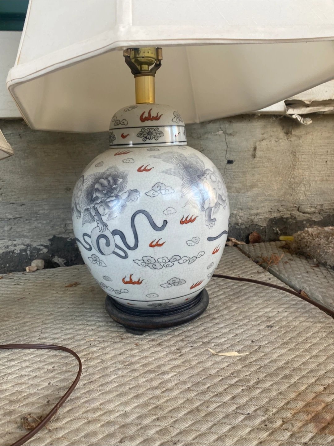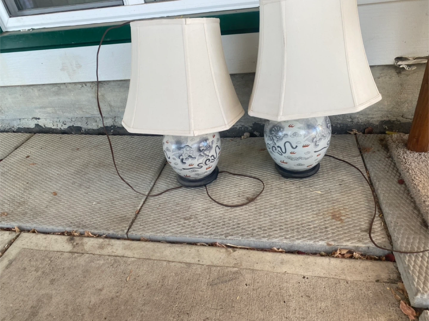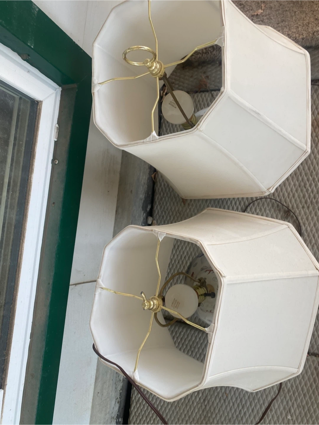 Selling a pair of decorative table lamps! They feature a unique design on the base and come with shades. Perfect for adding a touch of style to any room. One of the top rings is broken but the lamps work fine