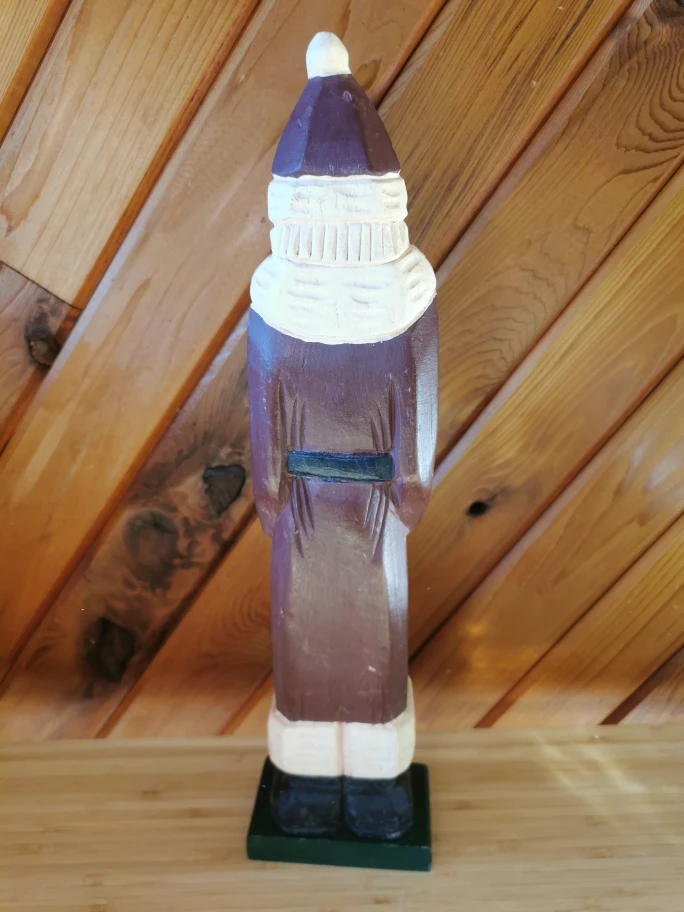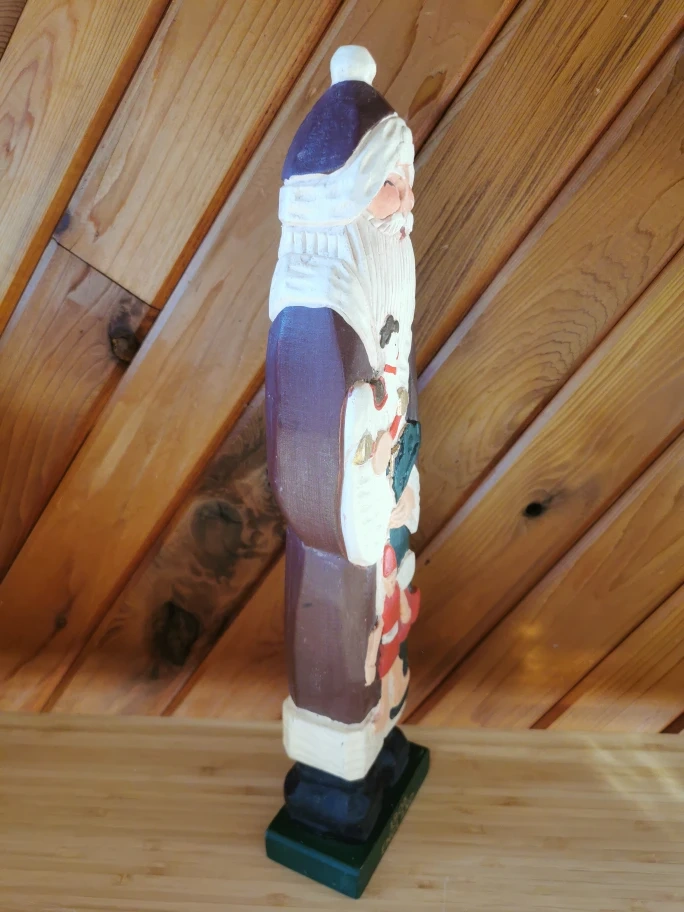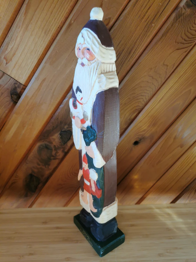 Vintage hand-carved tall wooden Santa Claus figurine holding a sack with a toy and a rocking horse. Beautiful hand painted Folk Art. Stamp indicates England, year 1905