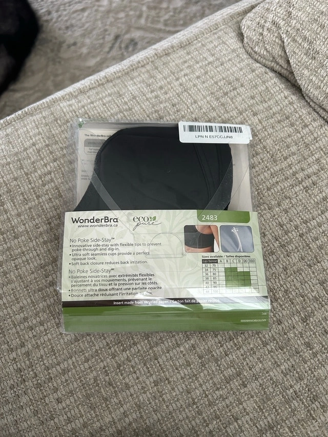 I'm selling a new WonderBra Eco Pure bra in size 36D. This wire-free bra features innovative side-stay technology for comfort and a seamless look. It has soft, ultra-soft seamless cups that provide a perfect opaque look, with a soft back closure reduces back irritation, ensuring it feels great all day.