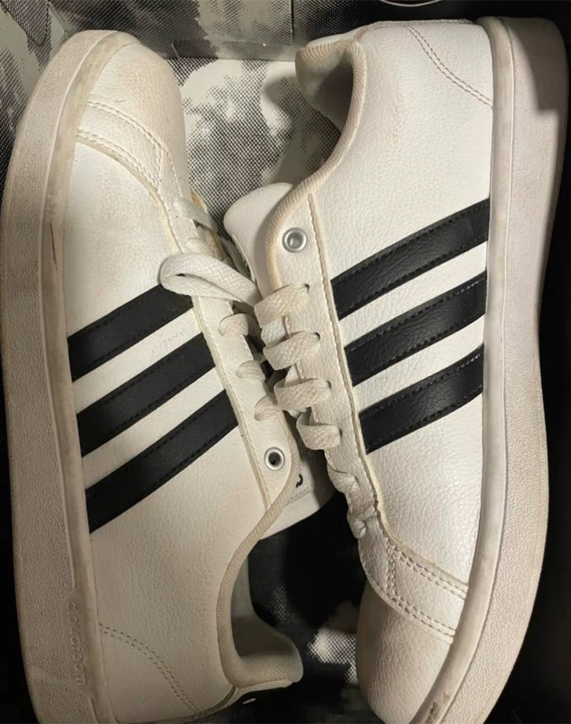 Selling a pair of Adidas Cloudfoam sneakers! They're white with the classic black stripes. These are super comfy and great for everyday wear. They do show some signs of use.