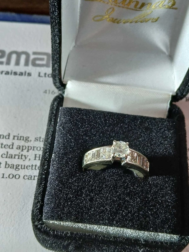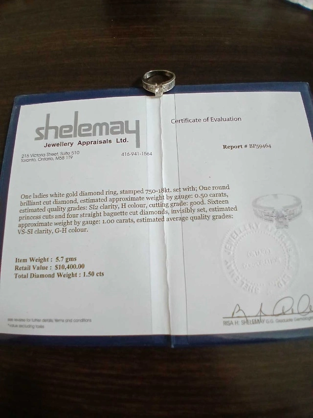 This is a beautiful 18k white gold diamond ring, featuring one round brilliant cut diamond (0.50 carats) and sixteen princess cut and four straight baguette cut diamonds (1.00 carats). The ring is stamped 750-18kt and has an estimated average quality grade of G-H colour and SI2 clarity. The item weighs 5.7 grams and was appraised at $10,400.00. This ring is in excellent condition. Asking 2900.00 but willing to negotiate If the ad is still up, the item is still available!