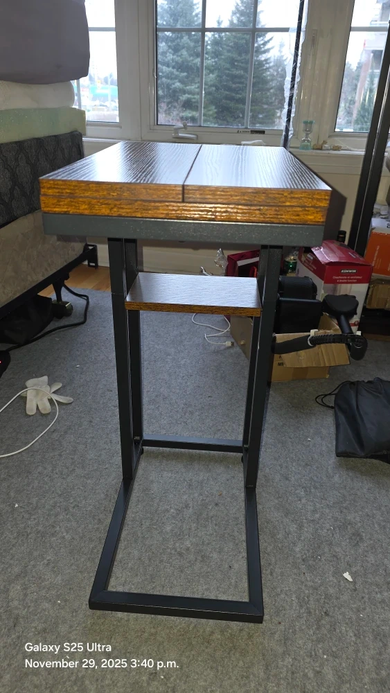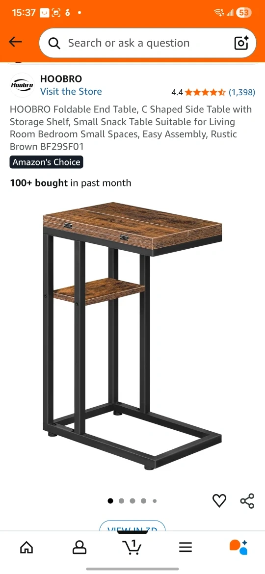 This is a HOOBRO Foldable End Table in rustic brown and black. It's a C-shaped side table with a storage shelf, perfect as a small snack table for the living room or bedroom. It's easy to assemble and great for small spaces!