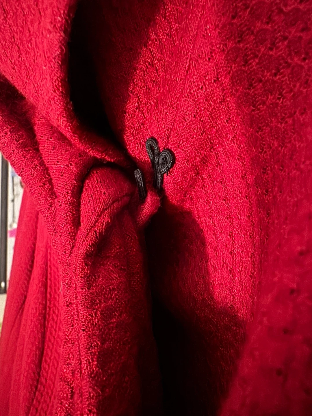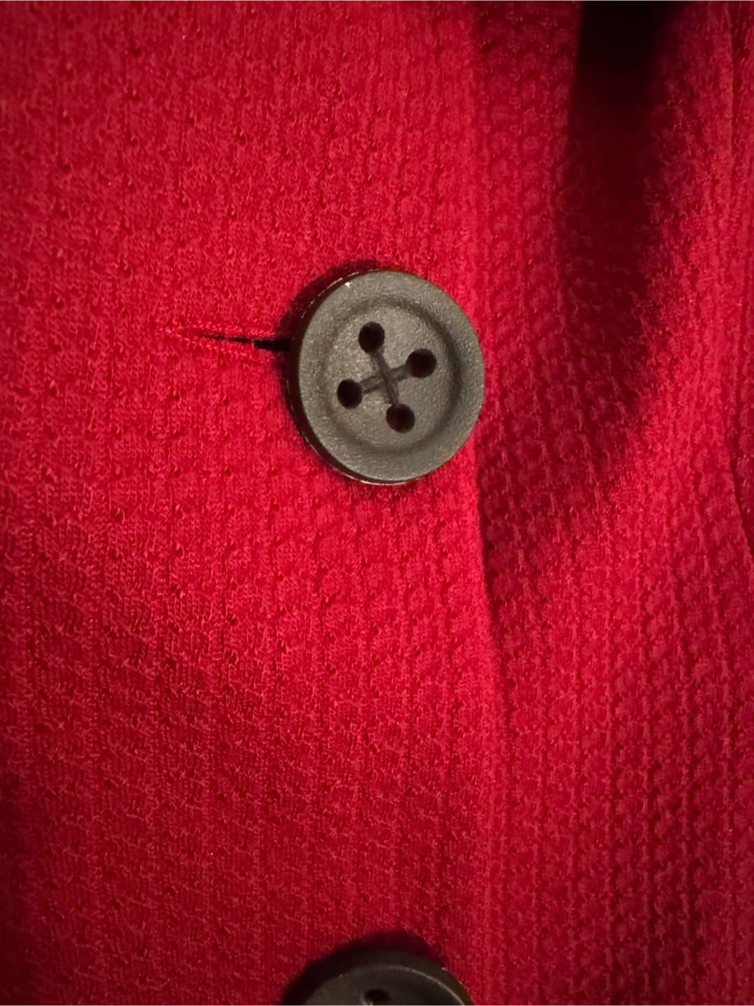 This is a lovely red coat, made right here in Canada! It's a size medium and features a unique button design and stylish collar. Perfect for adding a pop of colour to your wardrobe!