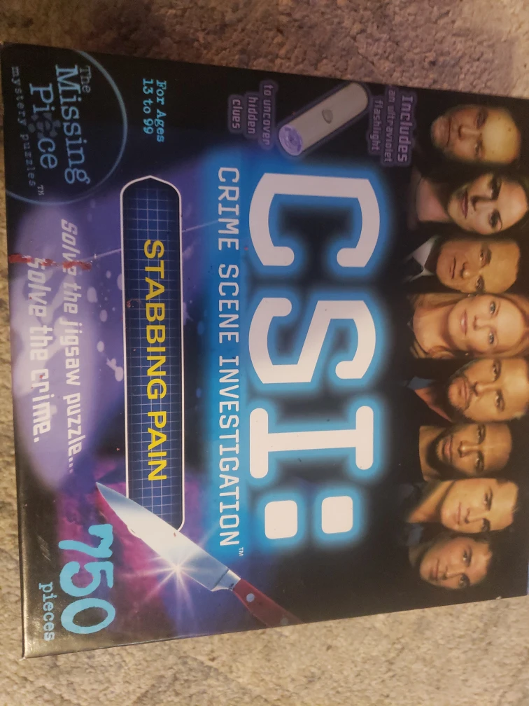 Selling a CSI: Crime Scene Investigation jigsaw puzzle called "Stabbing Pain"! It's a fun mystery puzzle with 750 pieces. Includes a booklet with the story, evidence, and solutions. Also comes with a special ultraviolet flashlight to uncover hidden clues. For ages 13 to 99