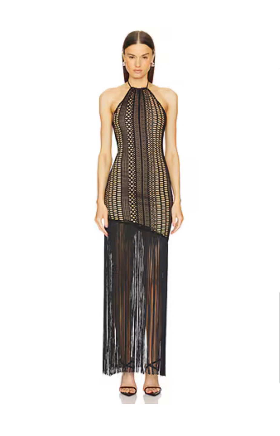 The iconic Michael Costello x REVOLVE Wren Maxi Dress in Black is the ultimate statement gown for nights where you want all eyes on you. Featuring a dramatic halter neckline, all-over geometric mesh paneling, and a striking asymmetric fringe hem, this dress blends high glamour with modern edge.