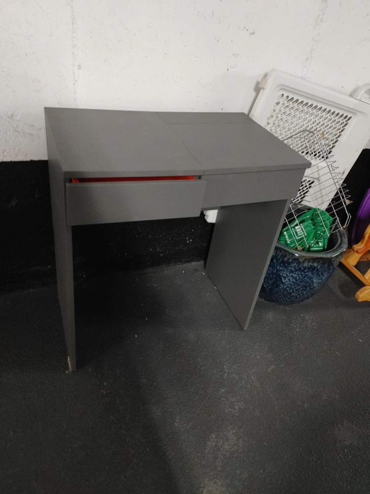 Selling a grey vanity desk with a vibrant red interior in the drawers. It's a unique piece ro It has a sleek design and is in good condition. Perfect for students or anyone needing a compact desk or vanity