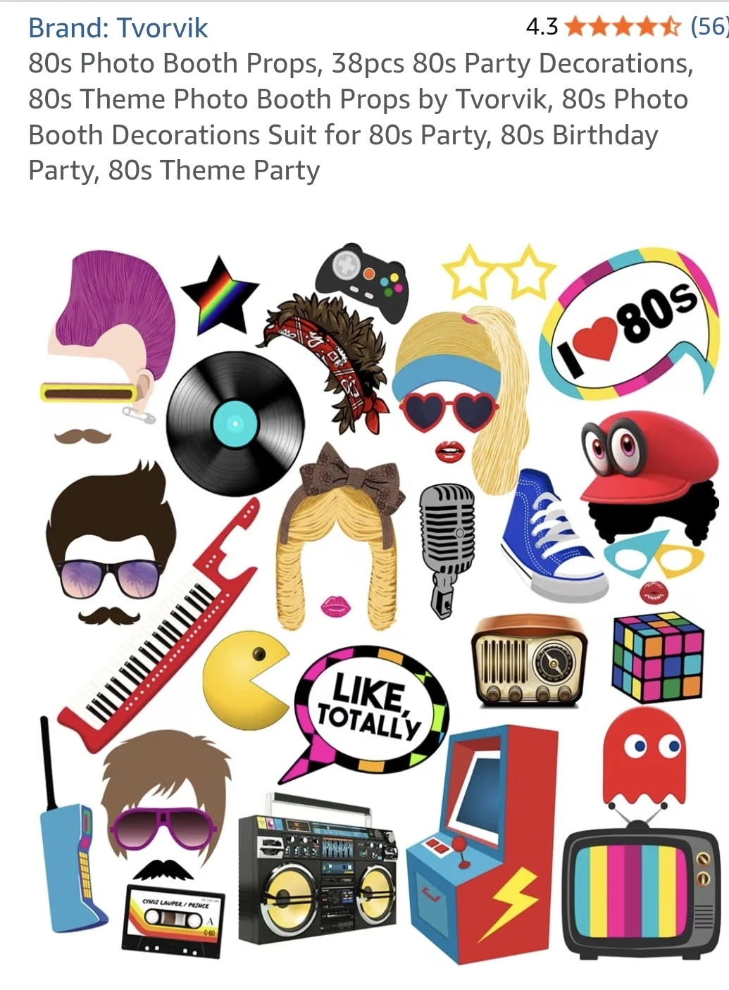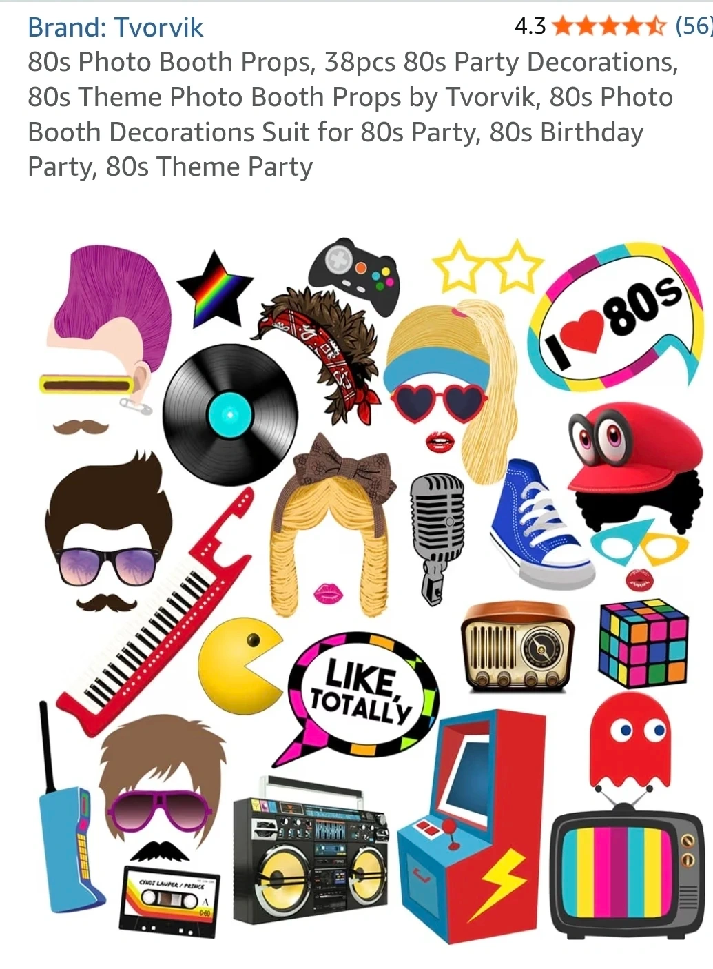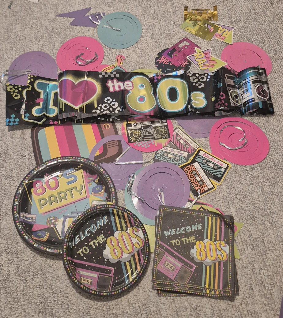 Get ready to party like it's the 80s! I have a bunch of decorations and photo booth props for an 80s themed party. There's a banner, plates, cutouts and more to make your party totally rad! Plates, napkins, tablecloth.