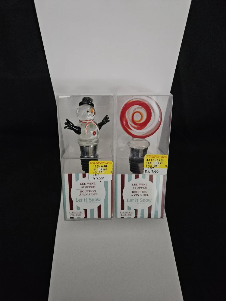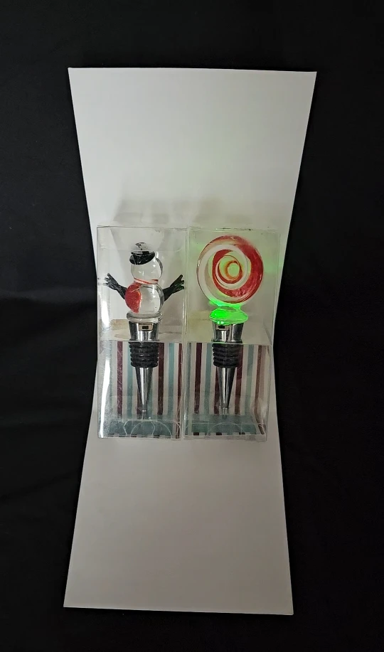 LED Wine Stoppers - Snowman & Swirl Candy. **The battery in snowman is dead and not working**. The Swirl Candy one does work and changes colour. Neither have been used. Price includes both.
