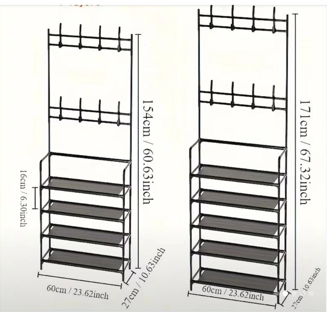 Declutter your entryway with this handy coat rack and shoe organizer! It features multiple shelves for shoes and plenty of hooks for coats, hats, and bags. The dimensions are approximately 171cm (67.32 inches) in height, 60cm (23.62 inches) in width, and 27cm (10.63 inches) in depth. It's a great way to keep everything tidy and organized. Ths