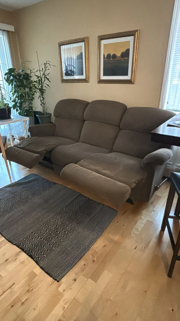 Selling a comfortable three-seat reclining sofa. It's in very good condition. NO RIPS/TEARS and the recliner function works smoothly on both ends. The colour is a neutral brown that fits well with most decors. It is made of a soft, durable material.note: Calgary