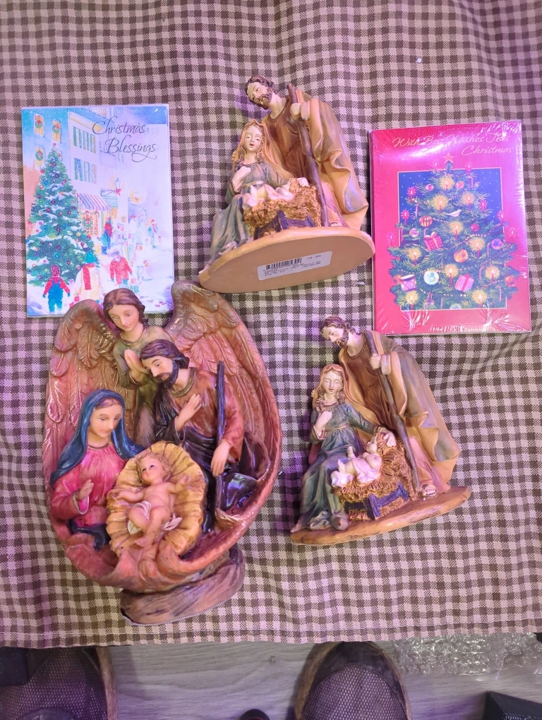 Selling a set of Nativity scene figurines 20 each or 3 for 45 as an added bonus each comes with 5 Christmas cards with envelopes .These are perfect for adding a touch of holiday spirit to your home! Brand new in a box.
