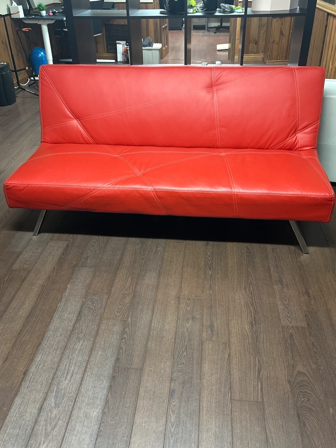 Selling a vibrant red futon sofa bed. It's in great shape and would be a fun addition to any living space or guest room! The material appears to be leather or a leather-like material. The legs are a sleek silver colour. Moving so must sell!!