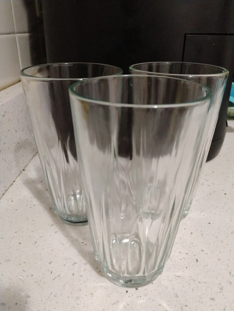 Free 🤗 a set of 3 clear drinking glasses. They are in great condition and ready for a new home. These glasses are perfect for everyday use or for entertaining guests. They have a simple yet elegant design that will complement any table setting.