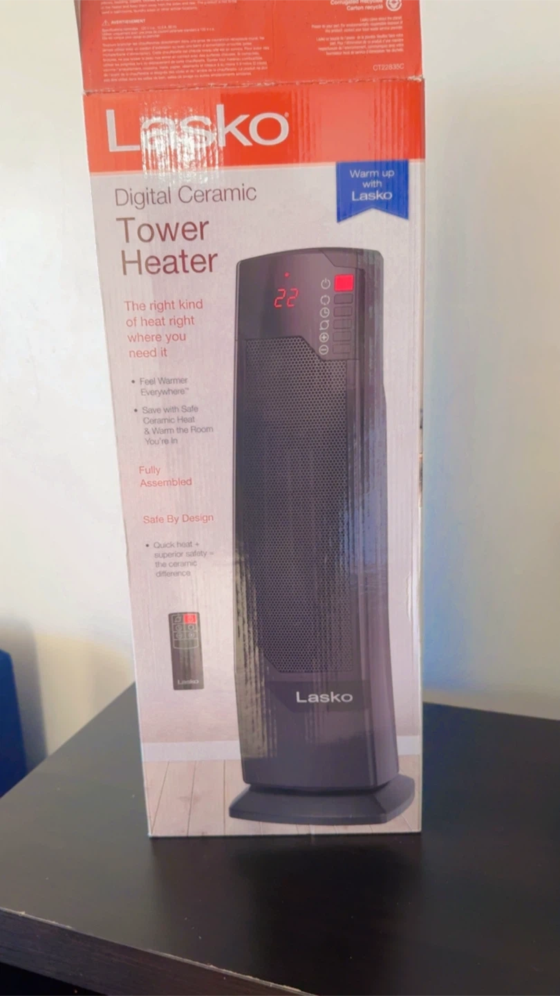 I'm selling a Lasko digital ceramic tower heater. It's fully assembled and safe by design. It provides quick heat and even room coverage. Feel warmer sooner with safe, ceramic heat where you're in