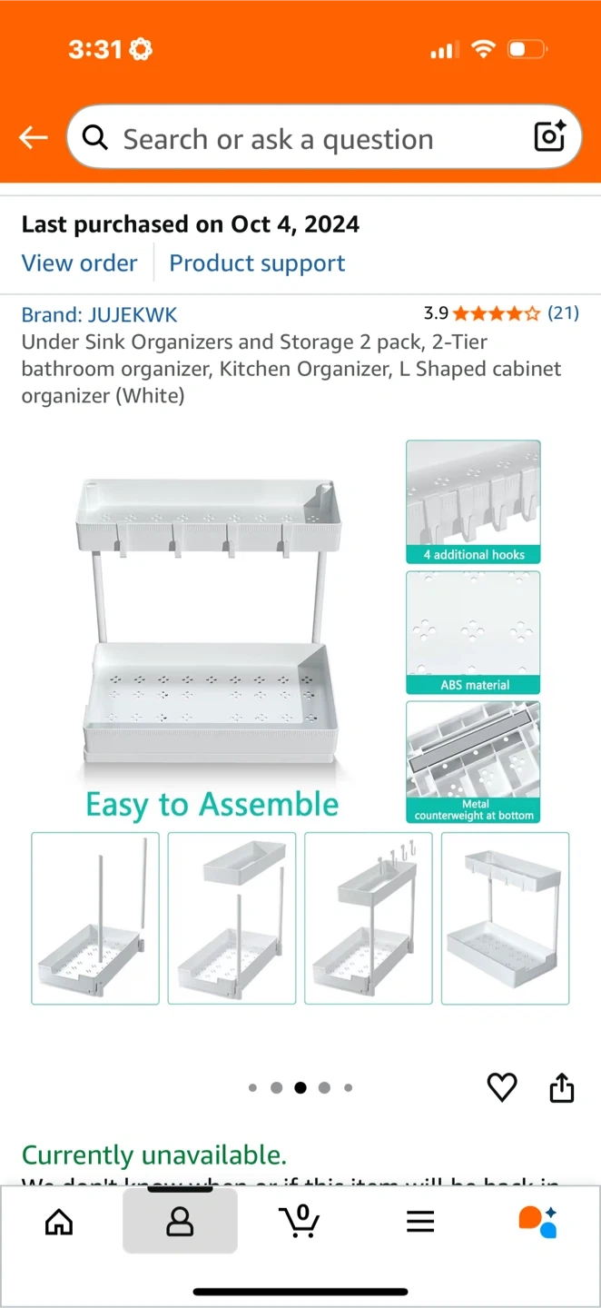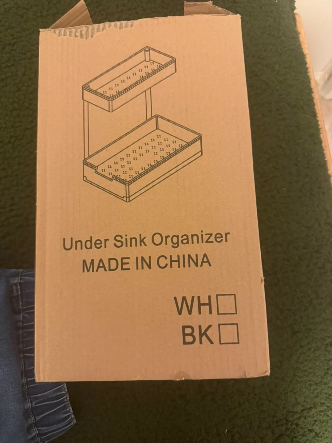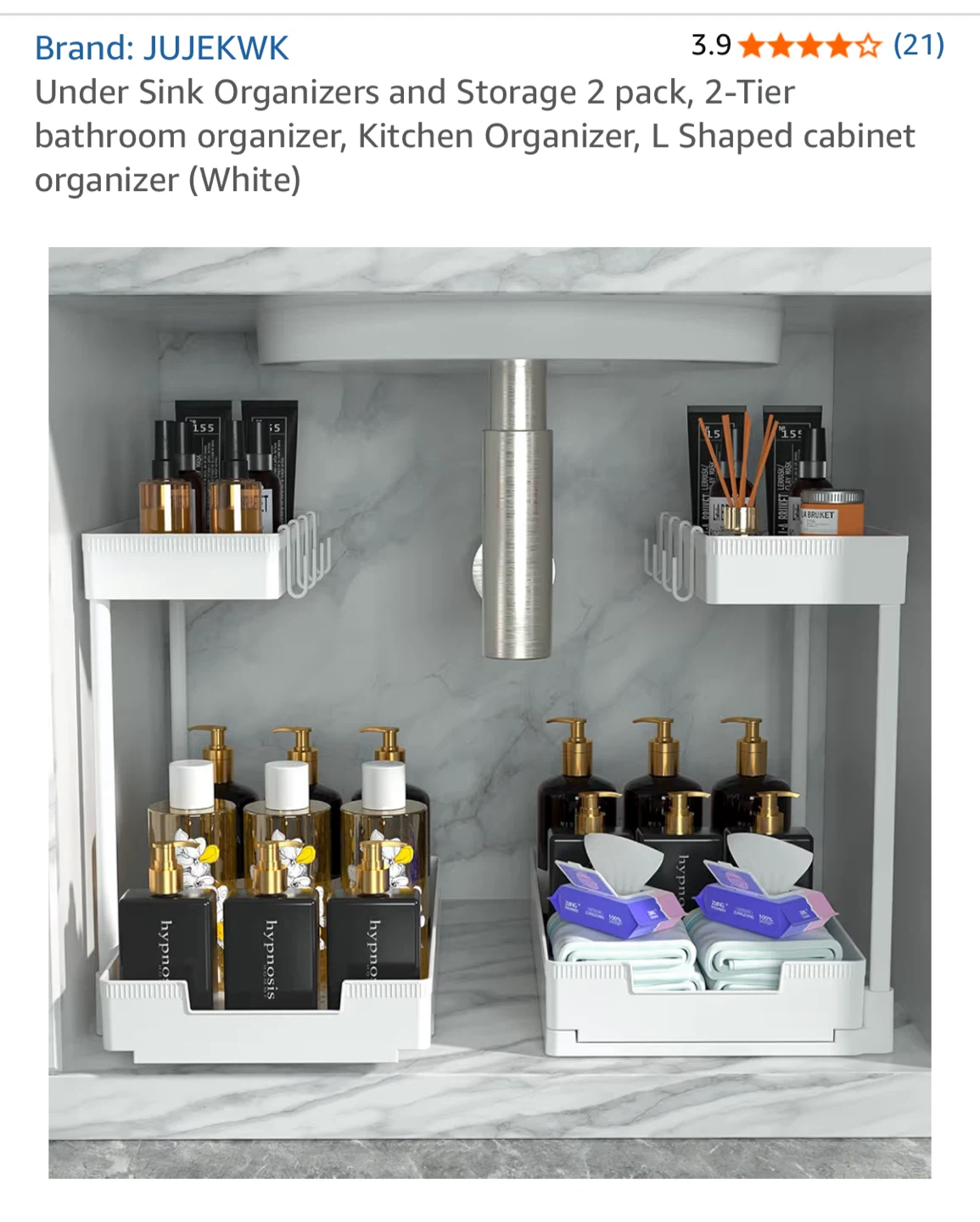 Selling a brand new JUJEKWK under sink organizer! It's a 2-tier organizer perfect for under the bathroom or kitchen sink. It's white and L-shaped, designed to fit neatly in your cabinet. The organizer also comes with 4 additional hooks. Easy to assemble and made with durable ABS material with a metal counterweight at the bottom. Comes in its original box!