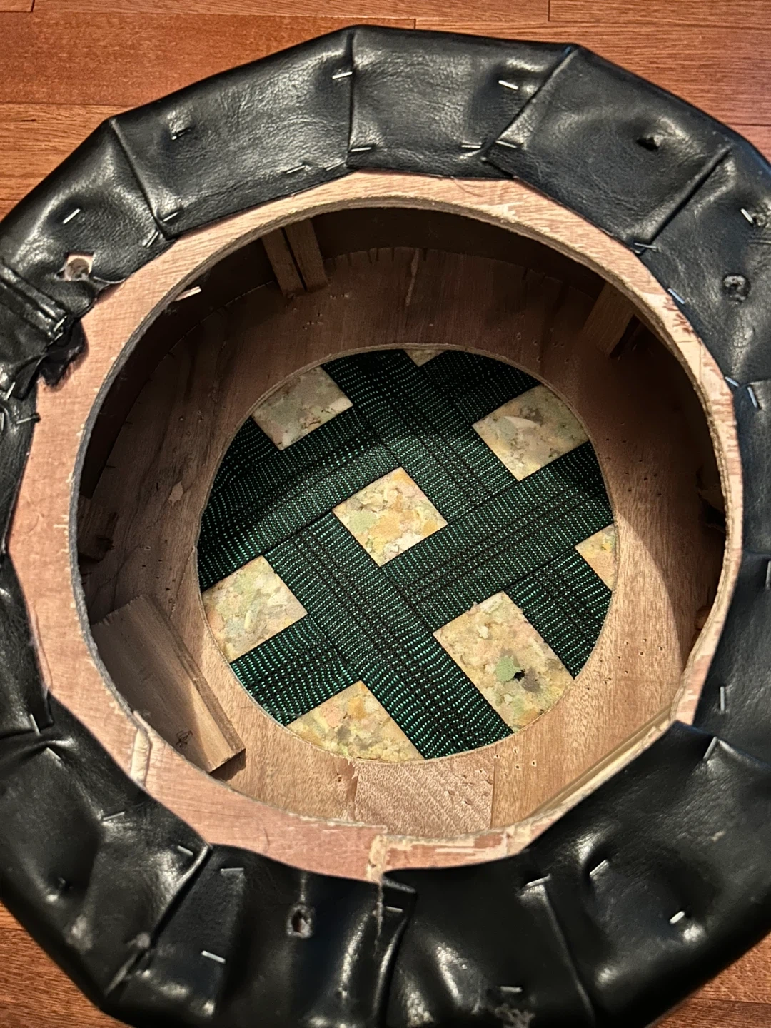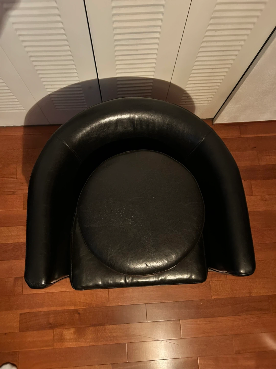 Selling a comfy black leather armchair. It has a unique, rounded shape and would be a great addition to any room. The leather shows some signs of wear, but it's still in good condition and ready to use!
