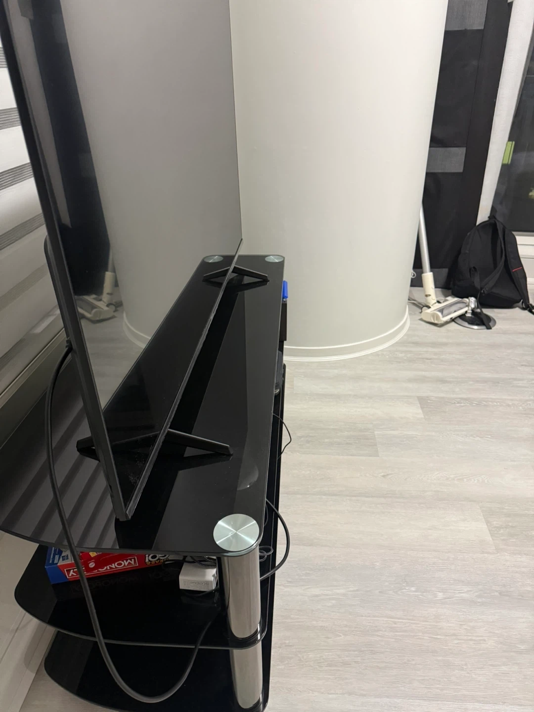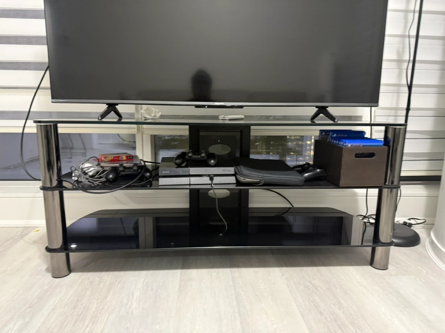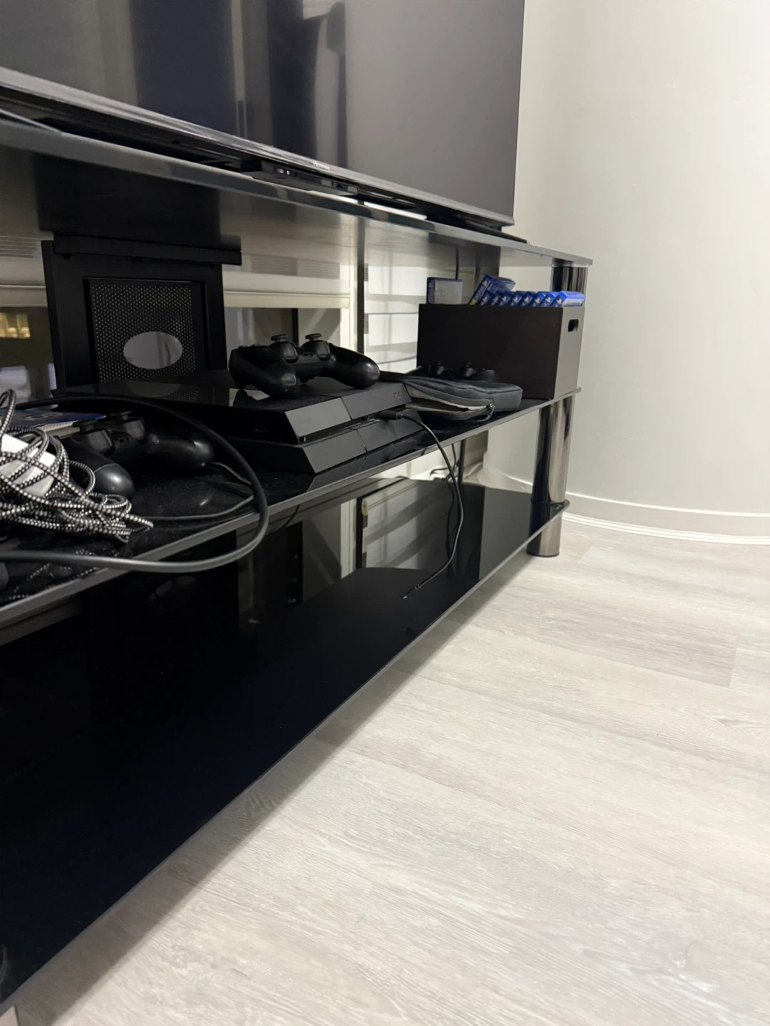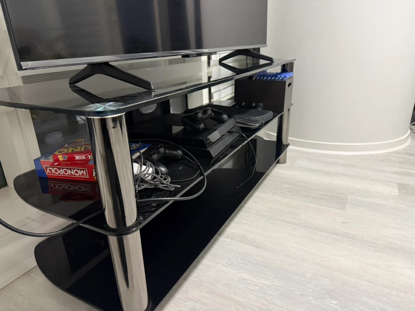 Selling a sleek black glass TV stand. It's in great shape and ready for a new home theatre setup! It features multiple shelves for media devices and accessories. The chrome legs add a modern touch.