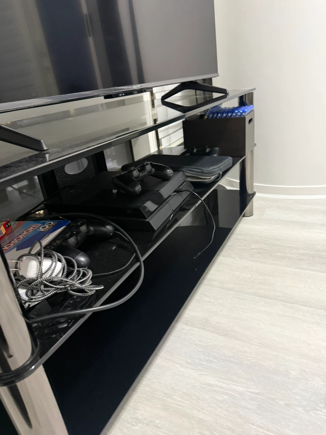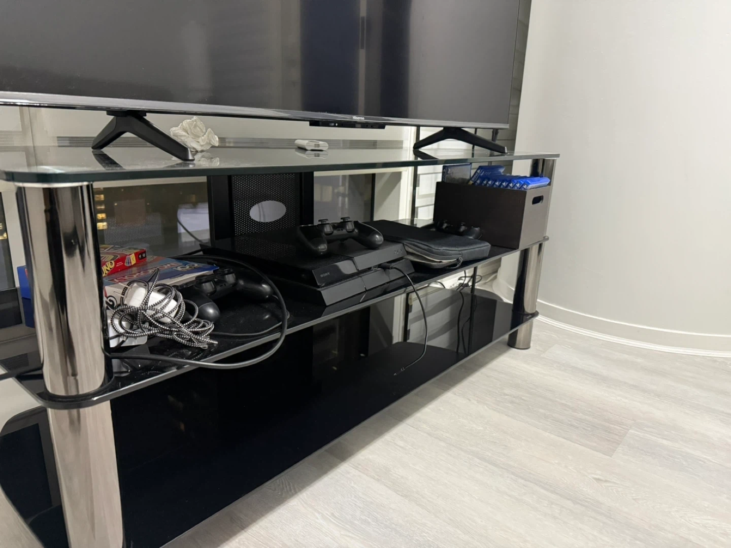 Selling a sleek black glass TV stand. It's in great shape and ready for a new home theatre setup! It features multiple shelves for media devices and accessories. The chrome legs add a modern touch.