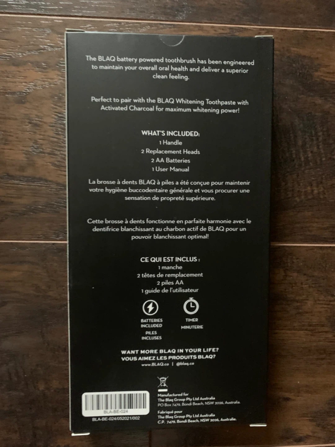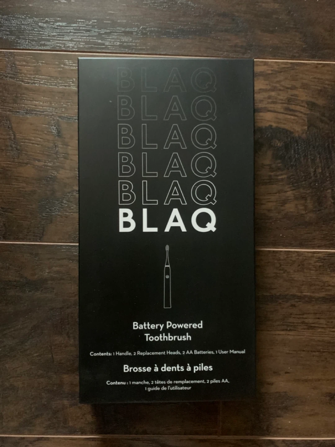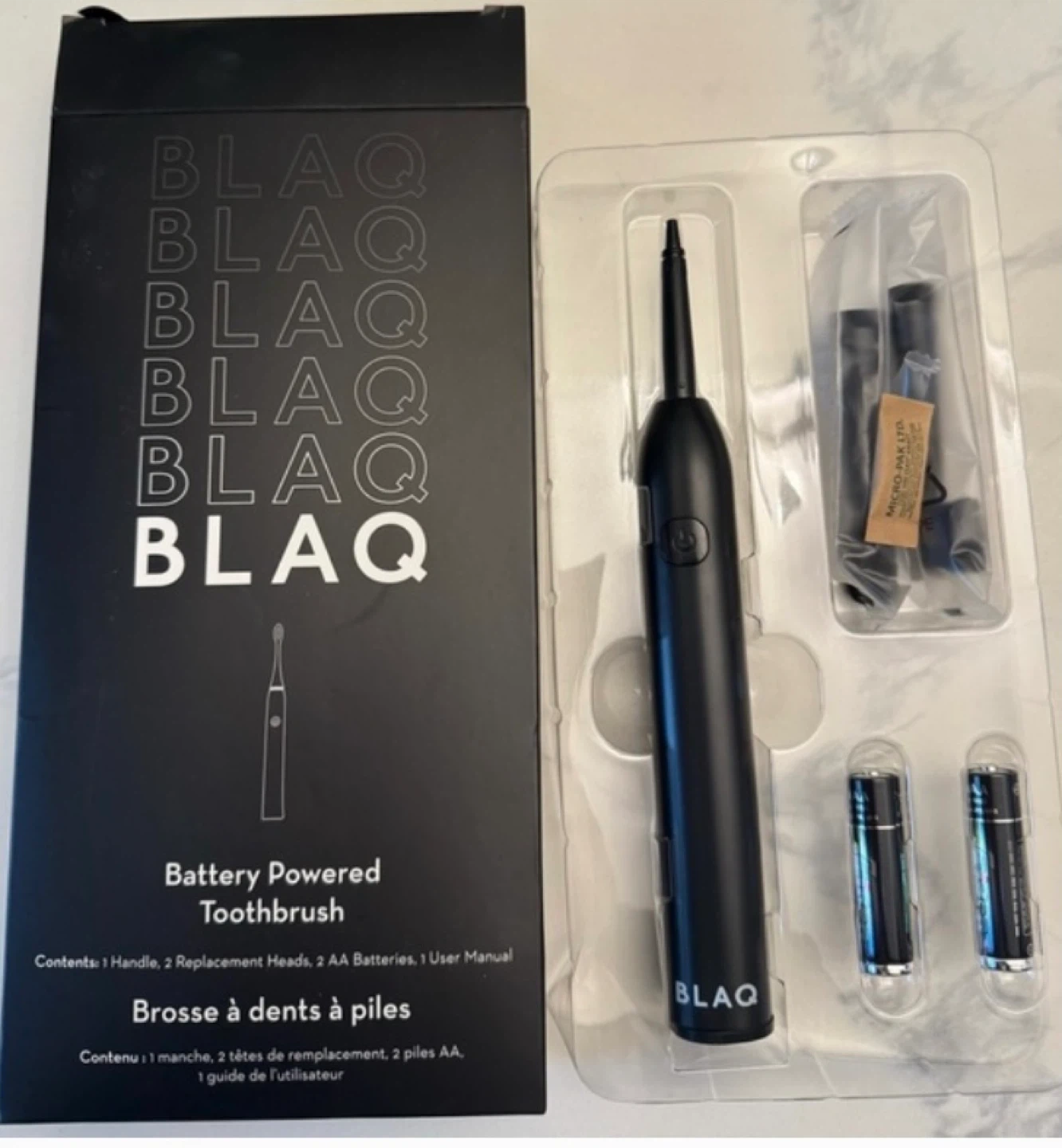 BLAQ battery powered toothbrush! It comes with: