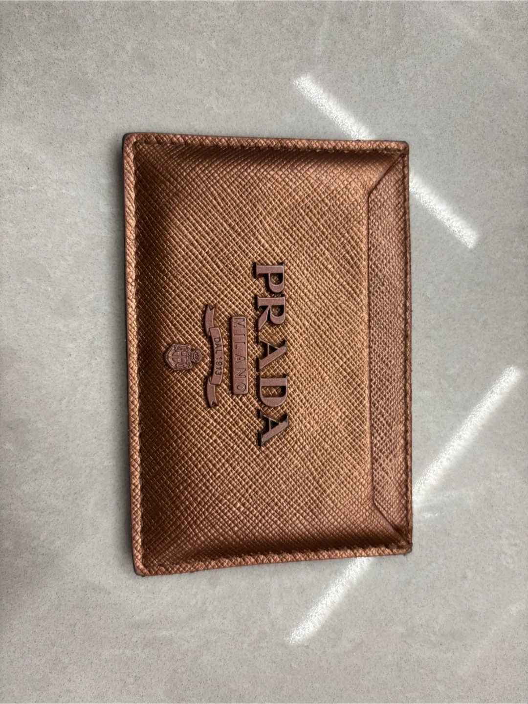 Selling a Prada card holder in a beautiful bronze colour. It's in great condition and perfect for carrying your essential cards. Comes with the box so a perfect gift for the holidays!