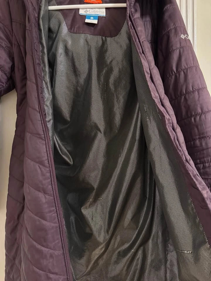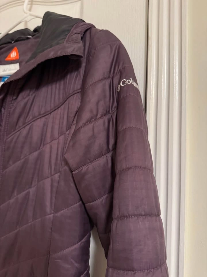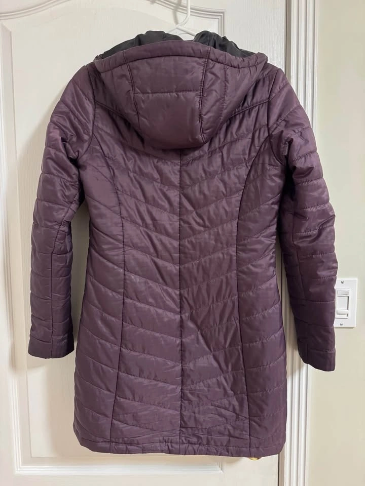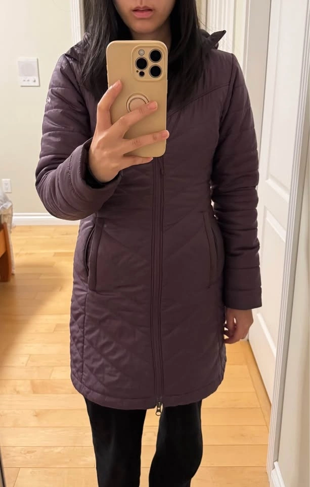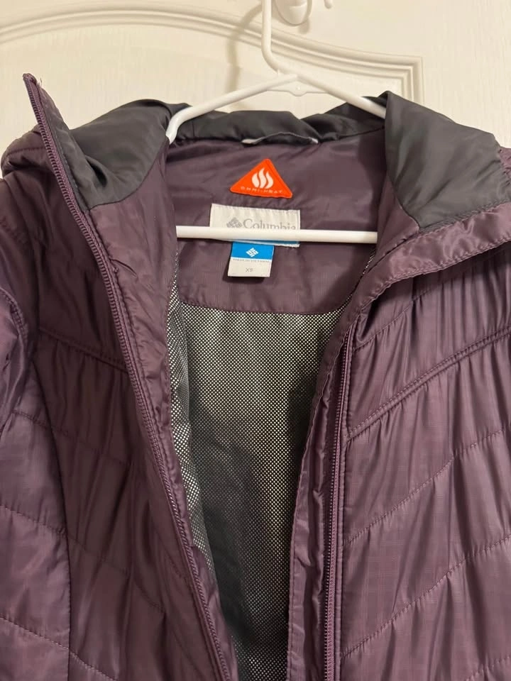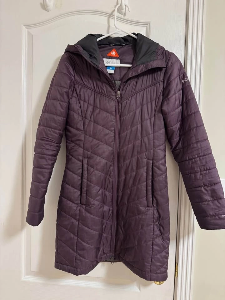 Long Purple Columbia Omni-heat Coat - Size XS/S Has Omni-heat technology that uses body heat for warmth Shell and lining are 100% polyester; arm sleeves are 100% nylon Double zipper heads in centre Has 2 side zip pockets and one inner zip pocket In great condition; no damages or issues Pick-up near Oakridge Centre