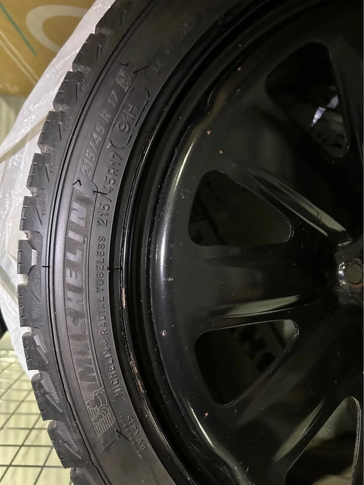 Set of Michelin tires in great condition with 17” clean black rims and TPMS sensors. Tire size 215/45R17 (91H) Tubeless. The steel rims have unique design to it compared to regular steels. Used for only 3 months on a 2023 BRZ before the car was returned. The tread is nearly new, with some vent spews still visible.