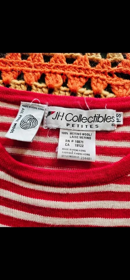 Sweater is in good used condition, and has one small spot near the sleeve hem (see last photo for detail) but looks great aside from that. It is a size PS Petite Small, and is made in Hong Kong by the brand JH Collectables.