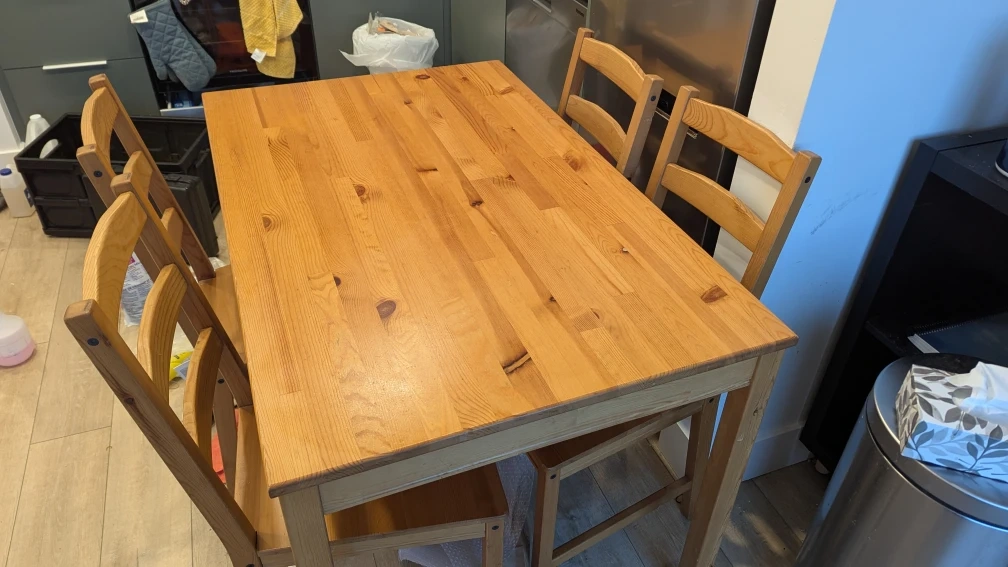 Selling a solid wood dining table from IKEA, along with four matching chairs. It's in good condition and perfect for a small dining area or kitchen. The set has a natural wood finish that would complement any decor!