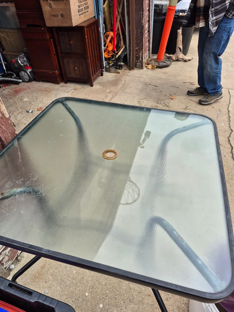 Selling a used glass top patio table. It has a black metal frame and a square glass top. There are some signs of use on the glass surface.