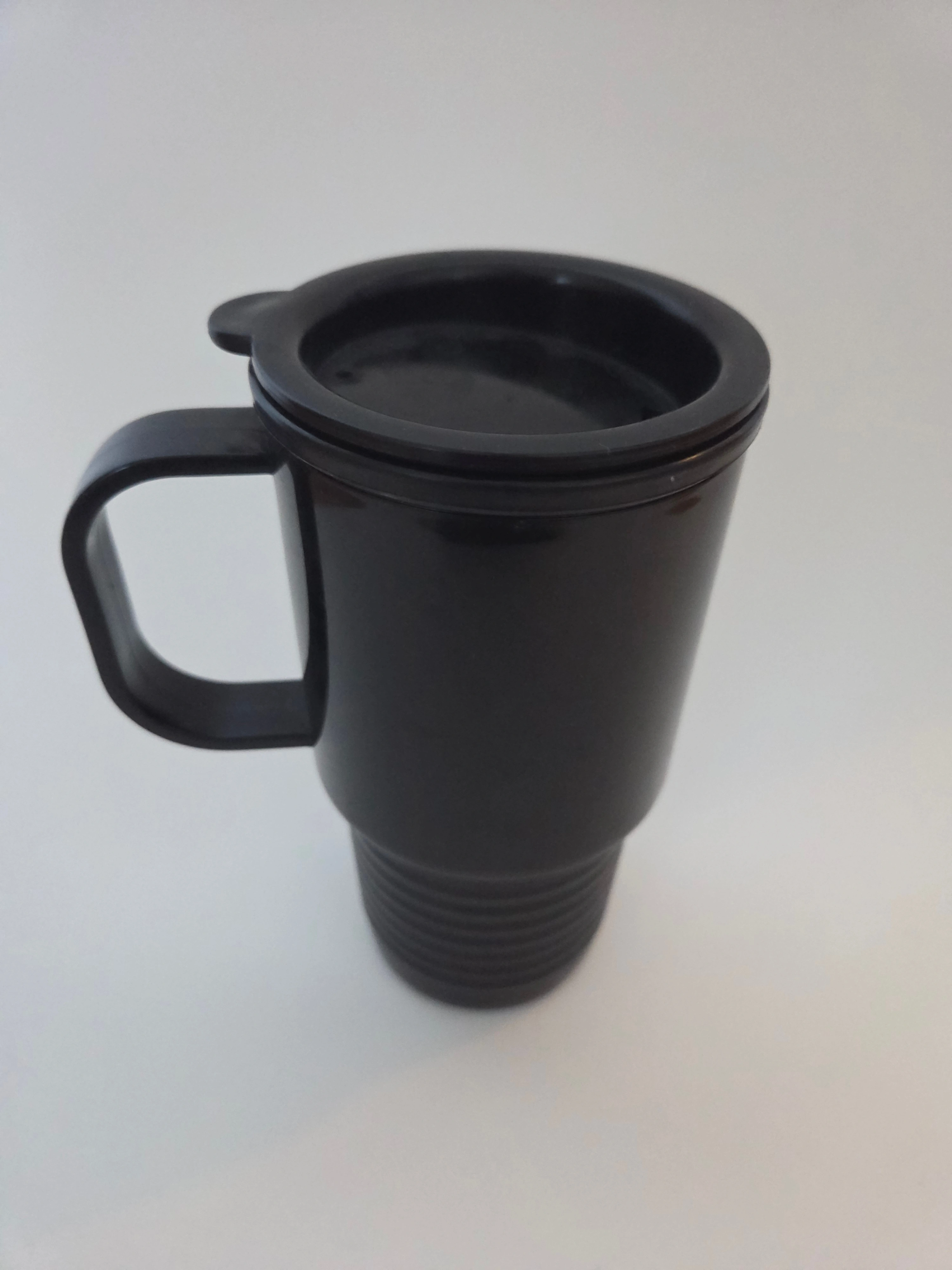 NHL Original Six travel mug featuring the classic team logos – Montreal Canadiens, Toronto Maple Leafs, Boston Bruins, Chicago Blackhawks, Detroit Red Wings and New York Rangers. Black plastic body with a ribbed base that fits most car cup holders and a press-fit splash-resistant lid (not fully leakproof).