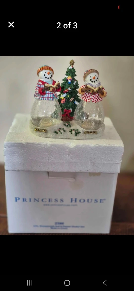 Cute Princess House salt and pepper shakers featuring snowmen and a Christmas tree! Comes with the original box, perfect for adding a festive touch to your dining table or kitchen